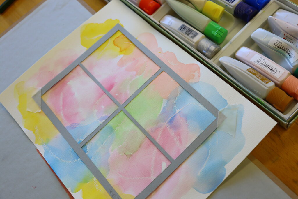 7色に塗った画用紙に窓のような「枠」をのせると、なんとも幻想的な世界が広がります。