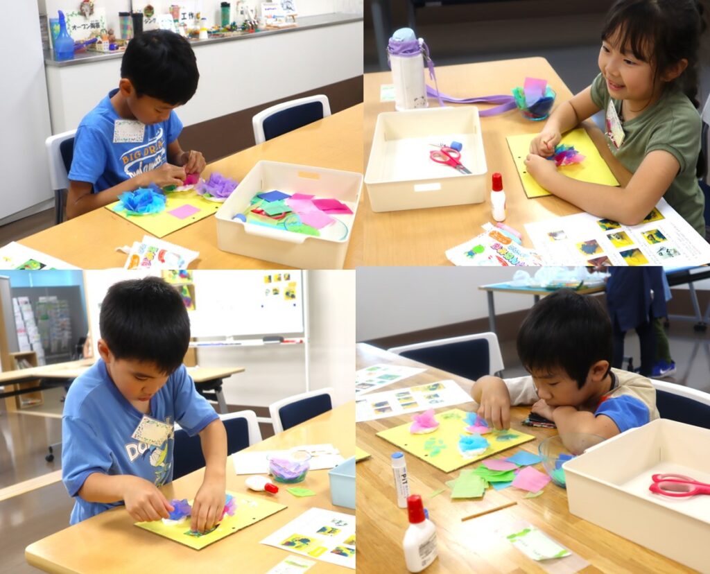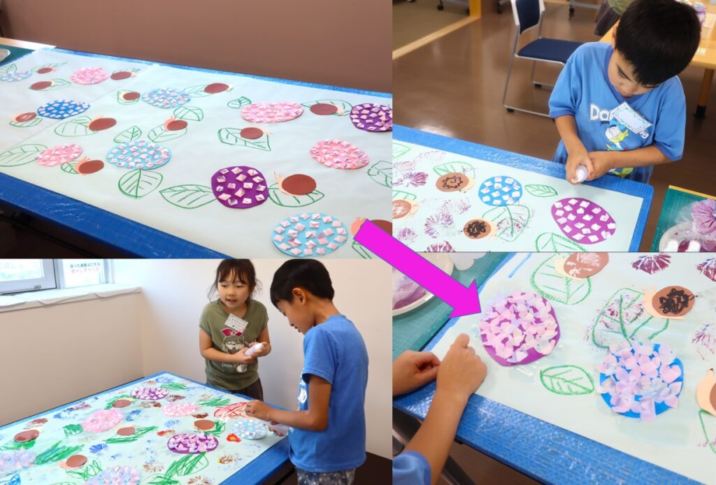 文化プログラム2のあじさいアートは、花紙を使って可憐なあじさいの創作物に取り組みました。