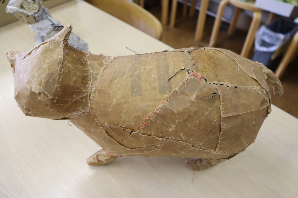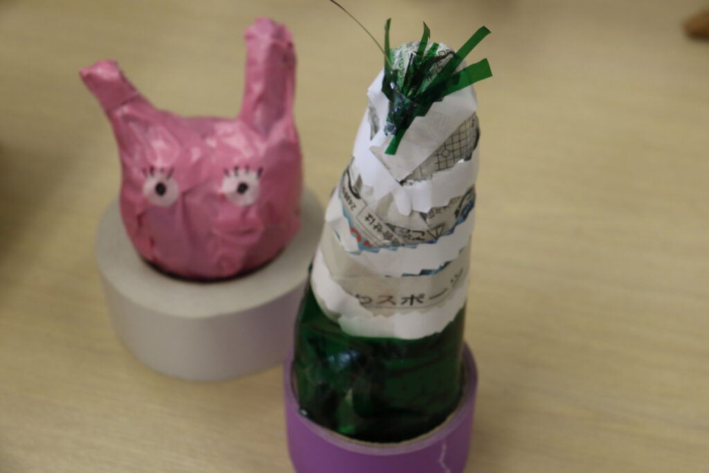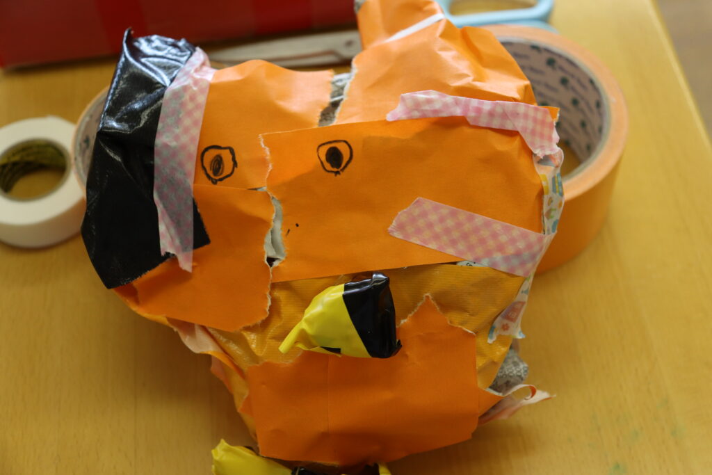 作品の色付けは、ペンや絵の具で塗ってもよいのですが、今回はみなさんカラーテープ(ガムテープのカラー版)を使用して、作成する方がほとんどでした。新聞紙がどのような作品に変身したでしょうか。