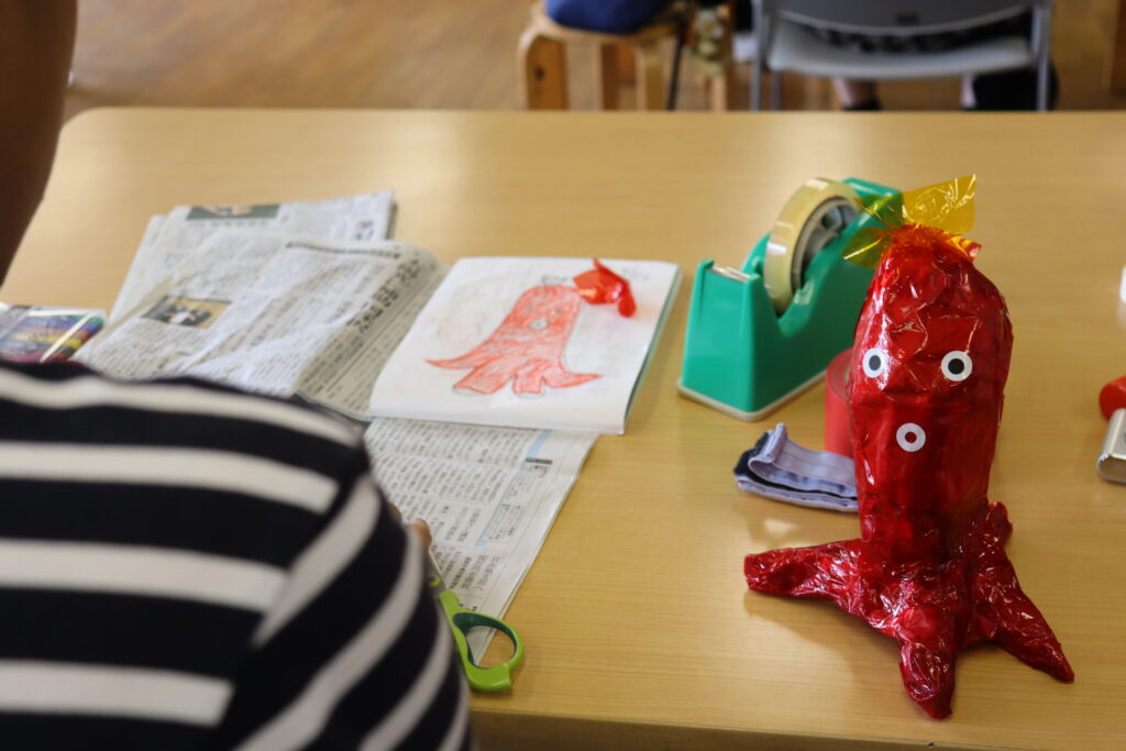 完成のイメージ図を描いてくれた方は、「たこさんウインナー」を作りました。カラーテープの上から赤色のセロハンも重ねて、ツヤツヤの「たこさんウインナー」が完成。とてもかわいいですね。