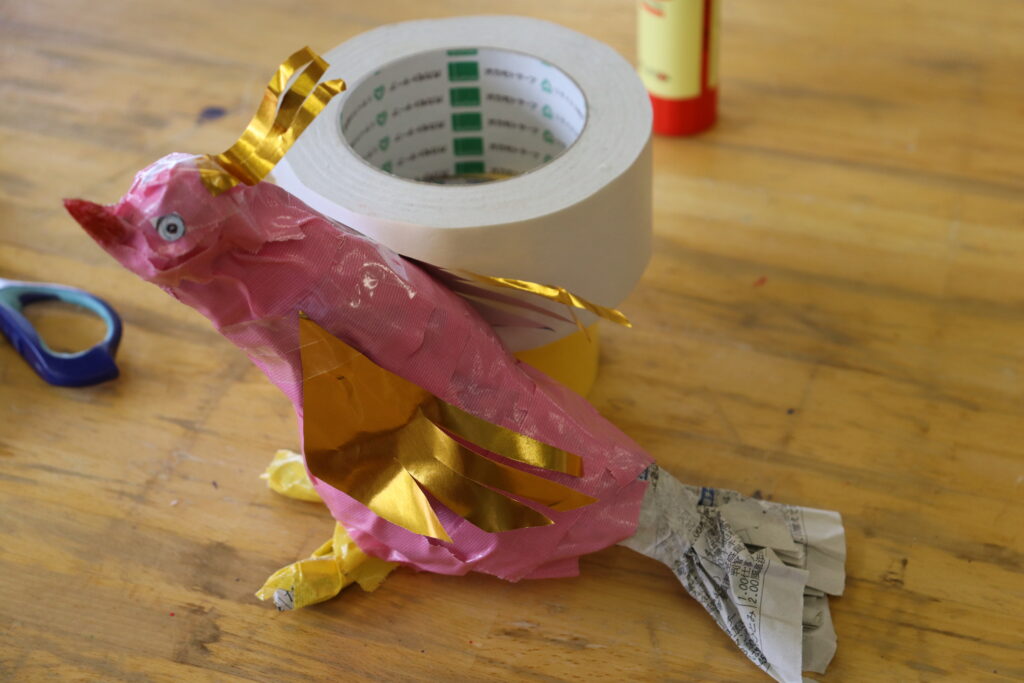 形ができたら形を固定する為に、セロハンテープやガムテープ(カラーテープ)を使って、固めていきます。