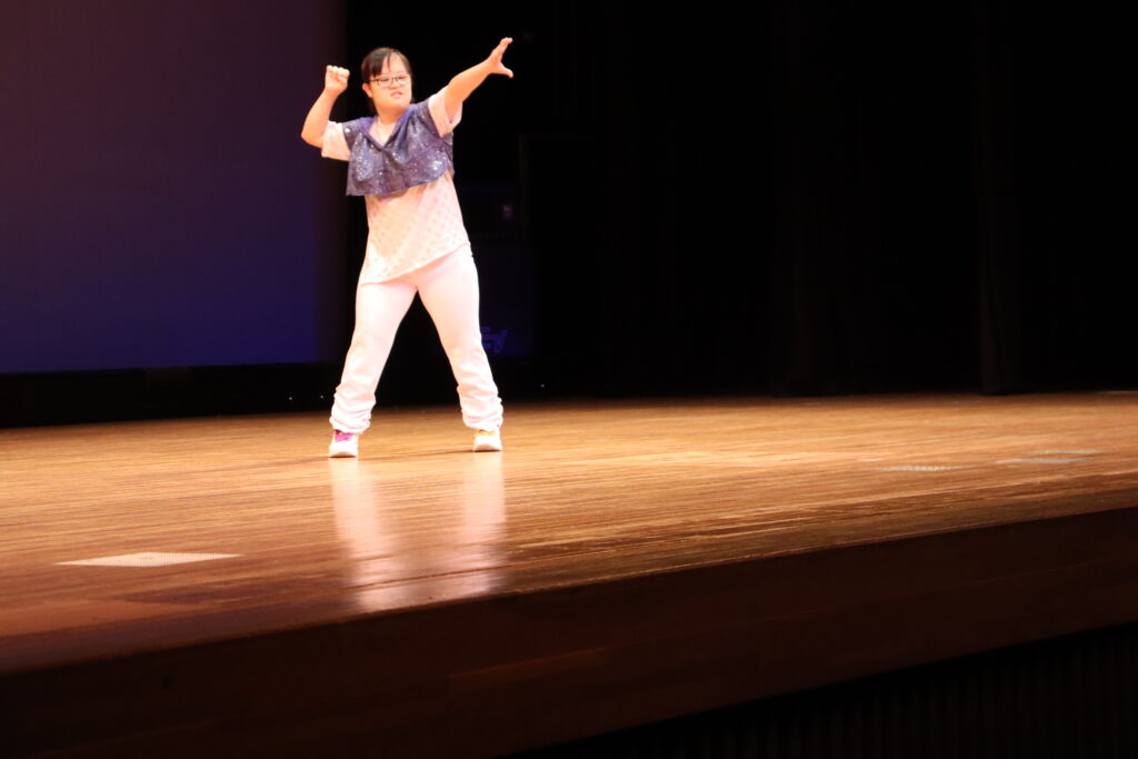 エントリーナンバー⑤番 秋山奈桜さん。DANCE@RAPPORT やカラオケ大会等、ラポールのイベントに積極的に参加してくれています。昨年に引き続き、自己流ダンスで会場を元気いっぱい盛り上げてくれました。