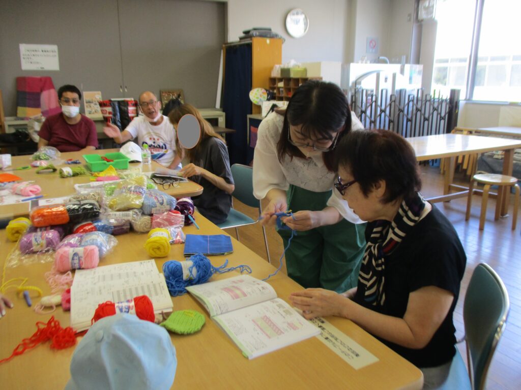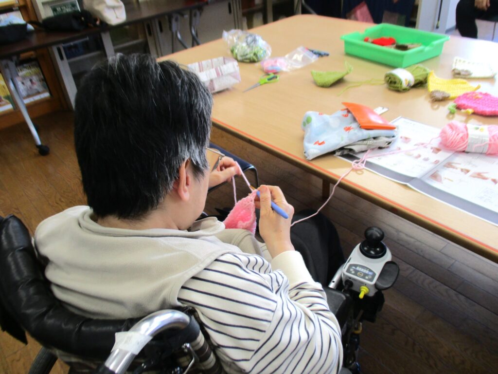 実施内容 中途障害者地域活動センター港北根っこの会の指導で、かぎ針でアクリルたわしを編みました。港北根っこの会は、平成3年に横浜市で初めて、脳卒中の後遺症など中途障害がある人たちが中心となって作った作業所で、ラポールでの教室は3回目です。参加した方は、「久しぶりの編み物です」「編み図が難しいです」などと話していましたが、いつの間にか集中して編み進めていました。根っこの会のメンバーさん達もいつもとは違う場所で過ごすのが面白い様子でした。
