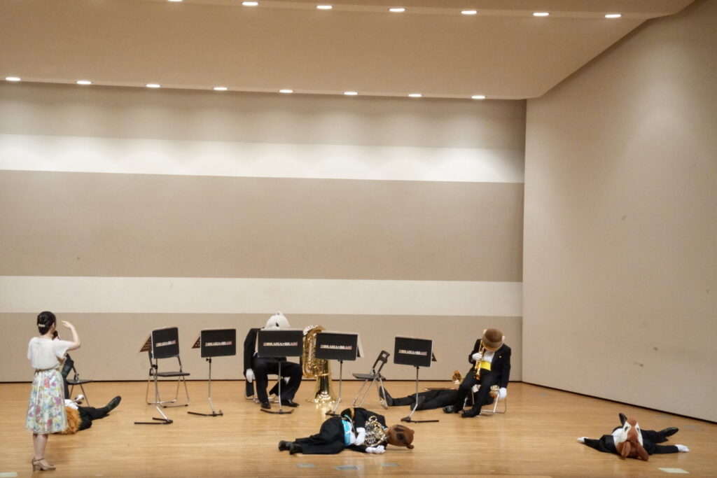 ホルンのマレーバクさんの番では…あれれ、マレーバクさんは、楽器を抱えたまま眠ってしまっています!会場中からの「起きてー!」という力を合わせたコールで、やっとこさ目を覚ましたマレーバクさんでしたが、なんと今度はマレーバクさんがホルンをひと吹きするごとに、ひとりずつメンバーが眠ってしまうハプニング!