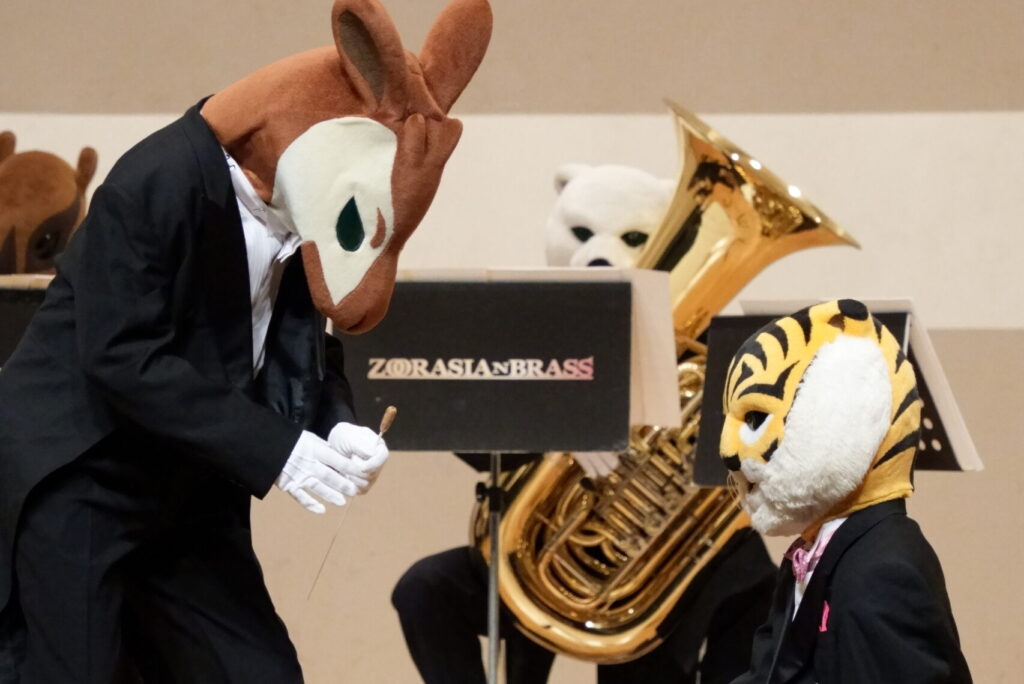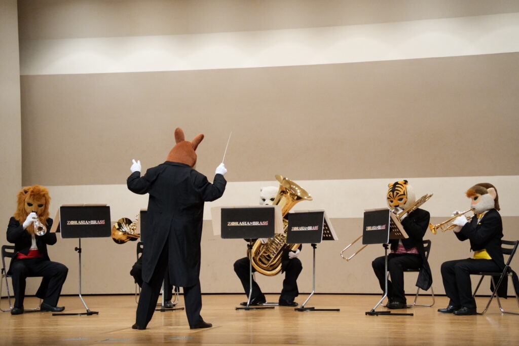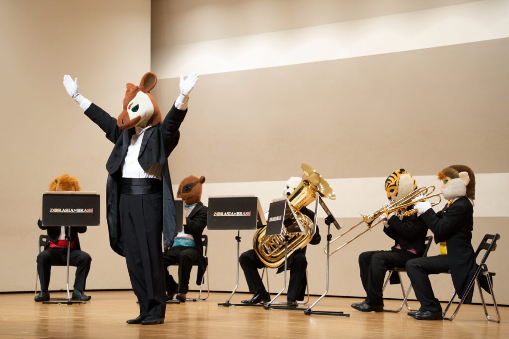 指揮者のオカピをはじめ、演奏するのは全て希少動物という金管五重奏「ズーラシアンブラス」。クラシック音楽における絵本のような役割ができれば…と2000年に誕生しました。海外公演を含め、全国各地で年間150を超える演奏会を行っており、また多数のCDをリリースしています。