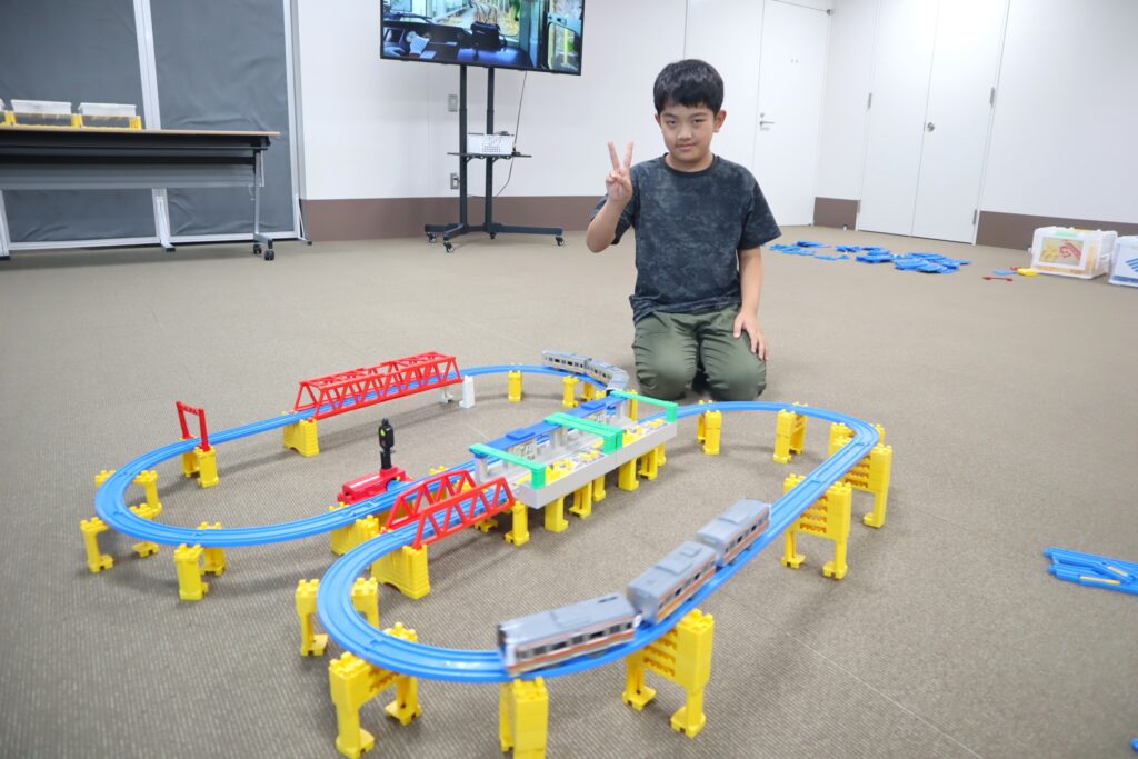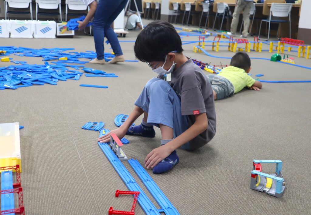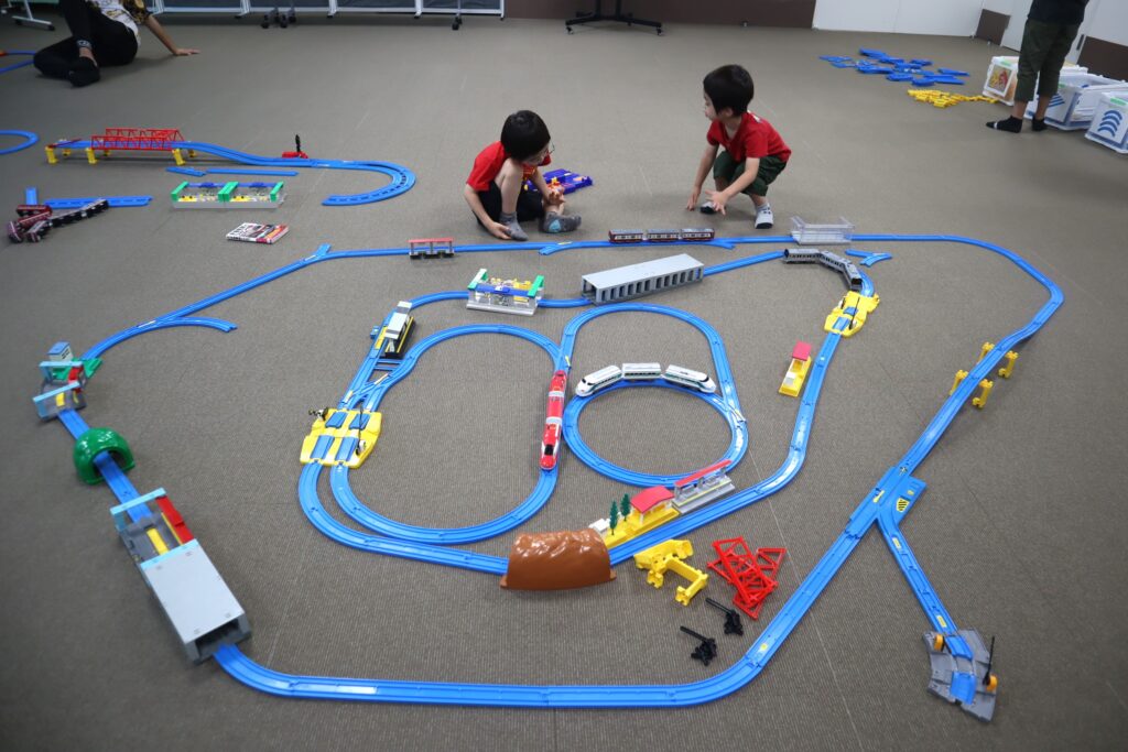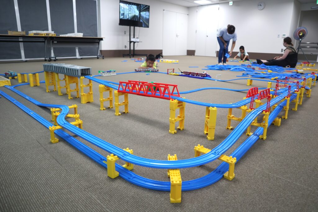 沢山のプラレールの車両や様々な情景部品、レール部品があるので、一人であれこれ考えて組み立てて楽しんでいるお子さんや、親子や兄弟で一緒にレールを組み立てて、ご自分達の世界を広げているご家族もいらっしゃいました。