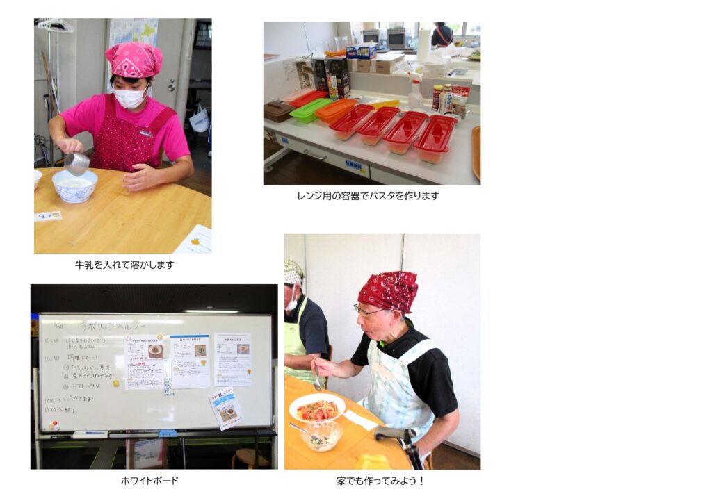 横浜ラポールでは8月10日(土)、健康相談コーナーの栄養士による料理プログラム「ラポクック・ヘルシー」を開催しました。7組8名が参加し、夏らしくさっぱりと、トマトたっぷりのパスタやヨーグルトベースのドレッシングを使った豆のサラダ、みかんと牛乳の寒天ゼリーを作りました。参加した方達の中には、調理に慣れていない方もいらして、スタッフのサポートを受けながら、調味料を量ったり混ぜたりと、真剣な表情で取り組んでいました。参加した皆さんで完成した料理を試食すると、「レトルトの豆は便利で使いやすそうだ」「次の料理教室はいつですか?」などと笑顔で話していました。私たちの「身体」は食べたものからつくられていきます。「ラポクック・ヘルシー」では、調理を楽しみつつ、健康的な食事について学び、自宅でも実践していただけるようにと思います。次のラポクック・ヘルシーは12月、中高生を対象に行います。