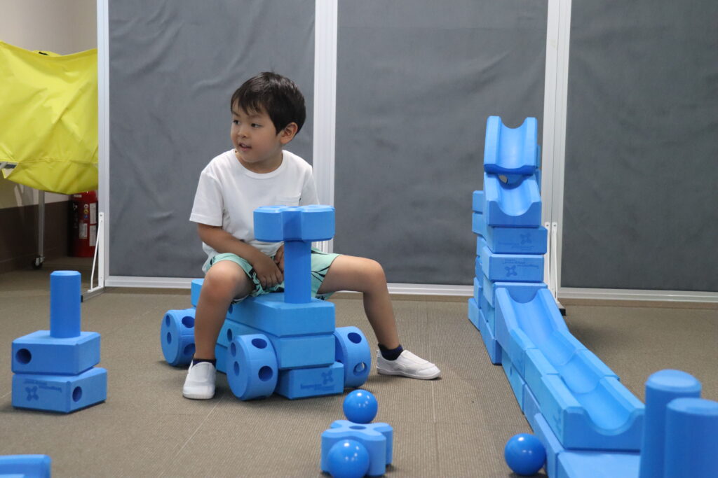 第3週目の多目的室の回では、エアトランポリンやサーキットの他、ボールプールやイマジネーションブロックなどで遊ぶことができます。今月からサイバーホイールも登場!広い場所だと少し落ち着かないお子さんでも、安心して参加できているようでした👍