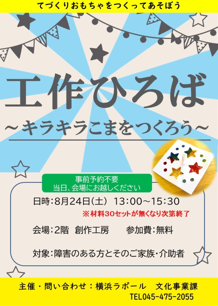 月替わりで手作りおもちゃがつくれる「工作ひろば」。8月の工作ひろばは「キラキラこま」を作りました。