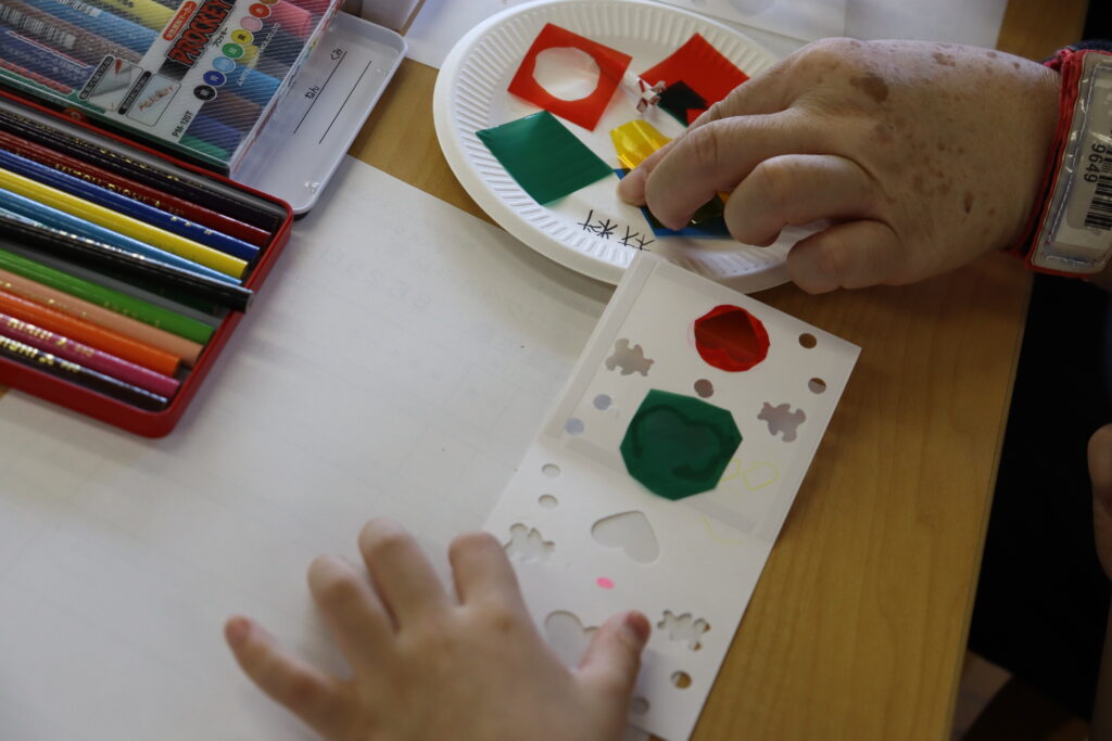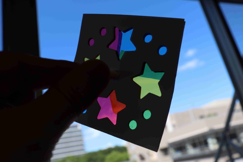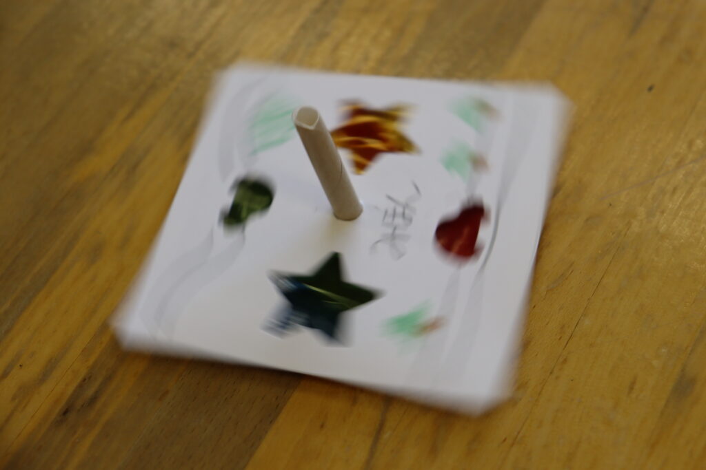 厚紙と色とりどりのセロハンを使った「キラキラこま」。コマなので、もちろんくるくる回して遊ぶこともできますし、セロハンの部分を透かしてみたり、懐中電灯やスマホのライトをコマにあてて、セロハンを投影して遊ぶこともできて2倍楽しめます。