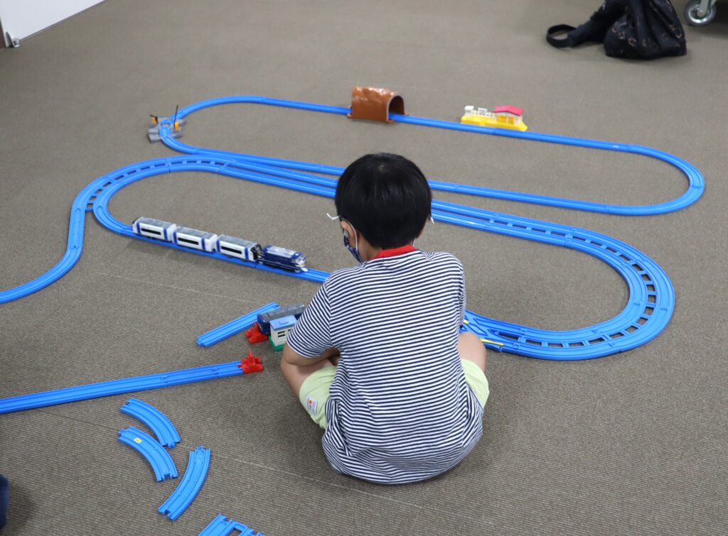 ラポール上大岡8階・多目的室の広い空間を使って、自由にプラレールを組み立てて、2時間思いっきり遊ぶことが出来る「プラレールであそぼう!」
