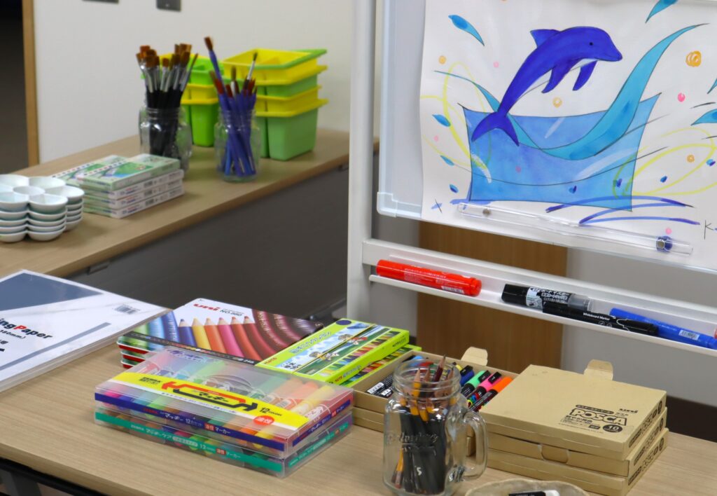 水彩絵の具をはじめ色鉛筆、クレヨン、油性ペンなど色々な種類の絵具を用意。