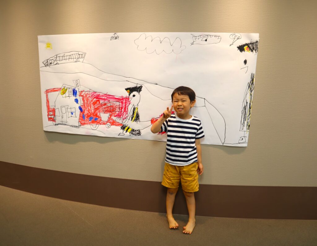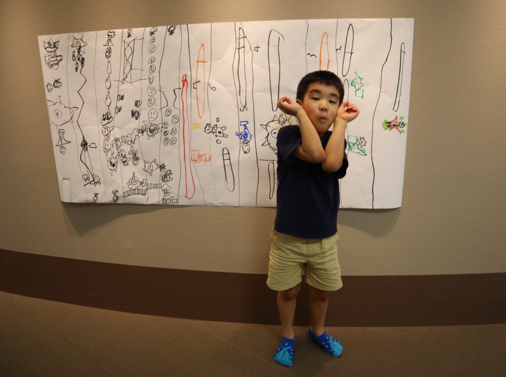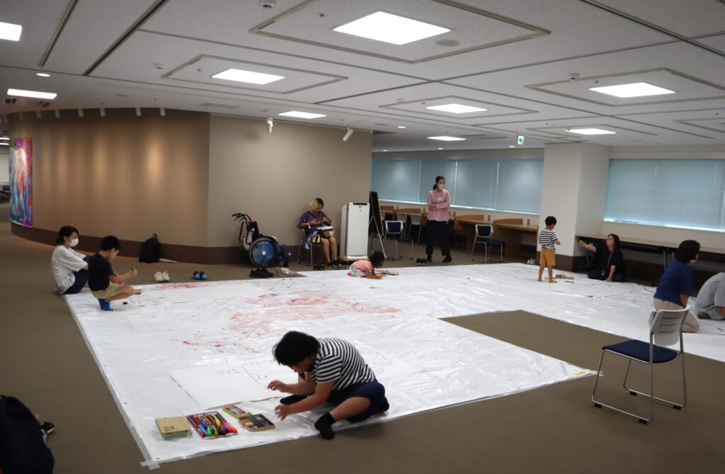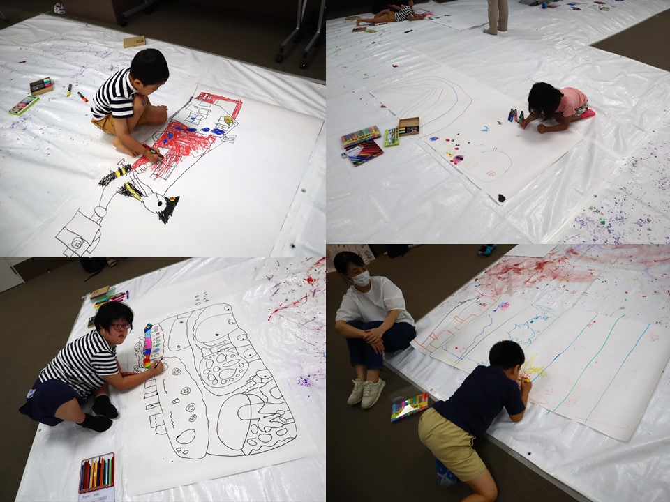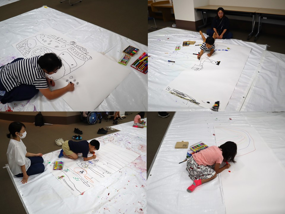 今回はいつもの創作エリアだけでなく、隣の多目的室も使い、大きな模造紙に思いっきり絵を描いてもらおうという内容でした。