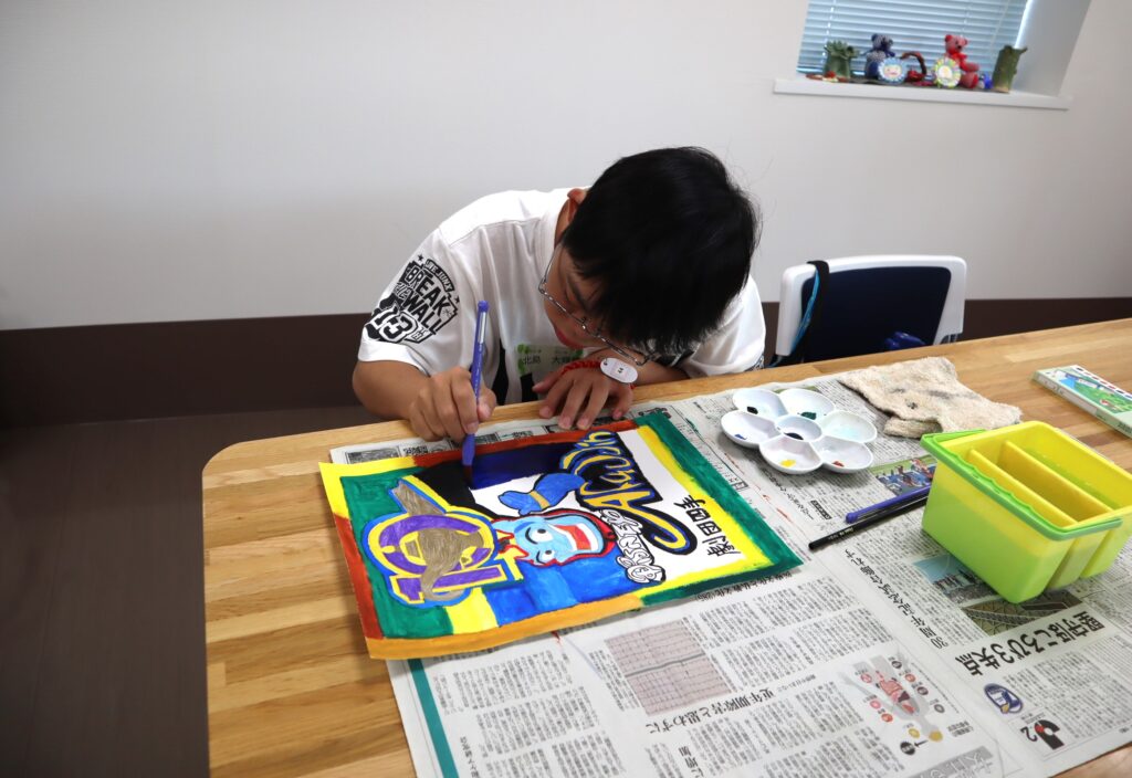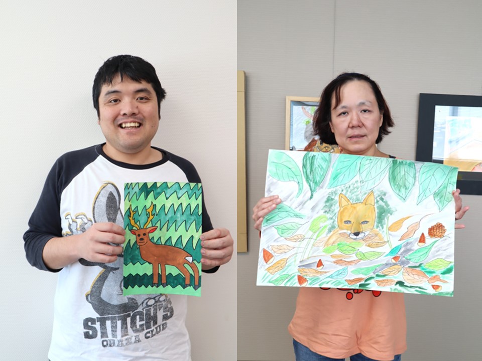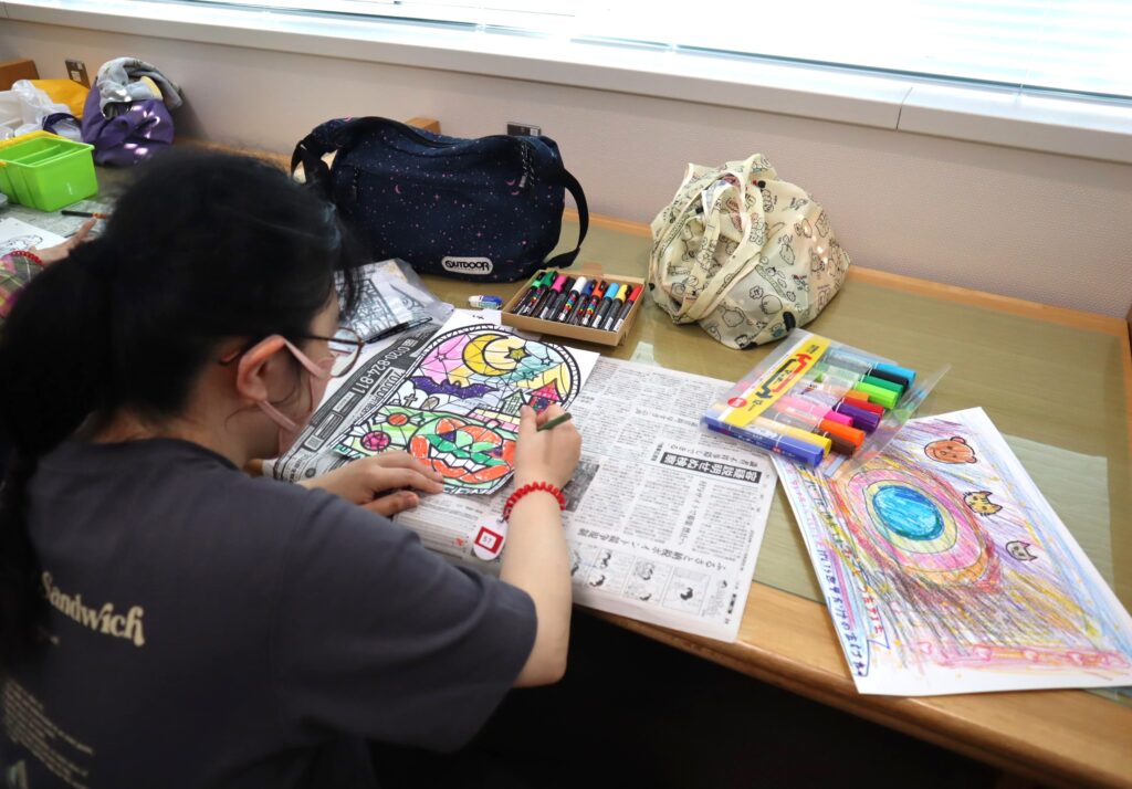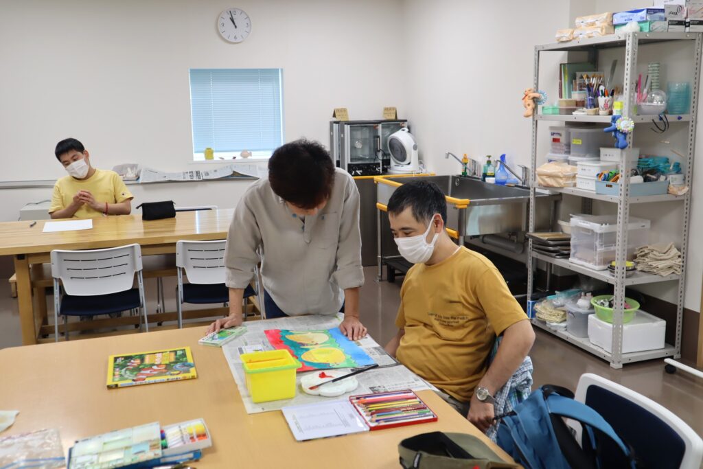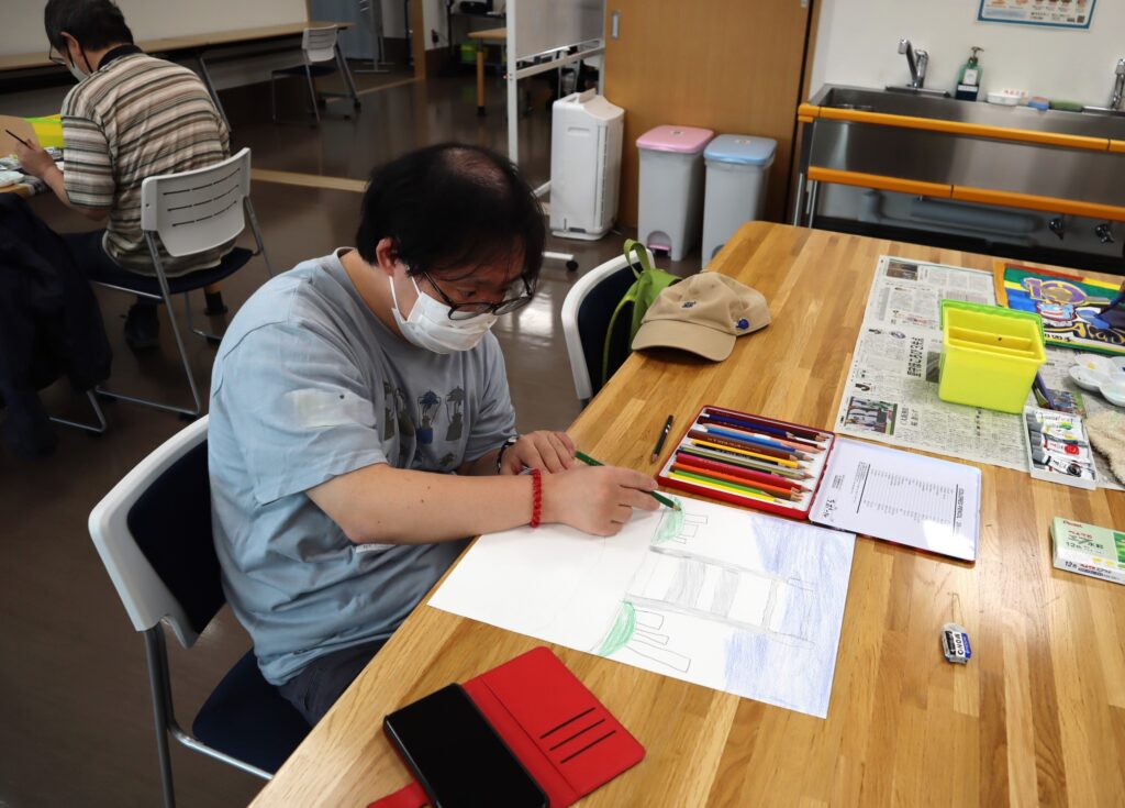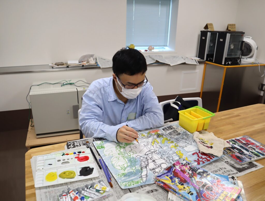 『絵画の広場』は、創作エリアと多目的室の両方の広いスペースのどこでも好きな場所に座って、自分のペースで2時間集中して絵画制作に取り組めます。