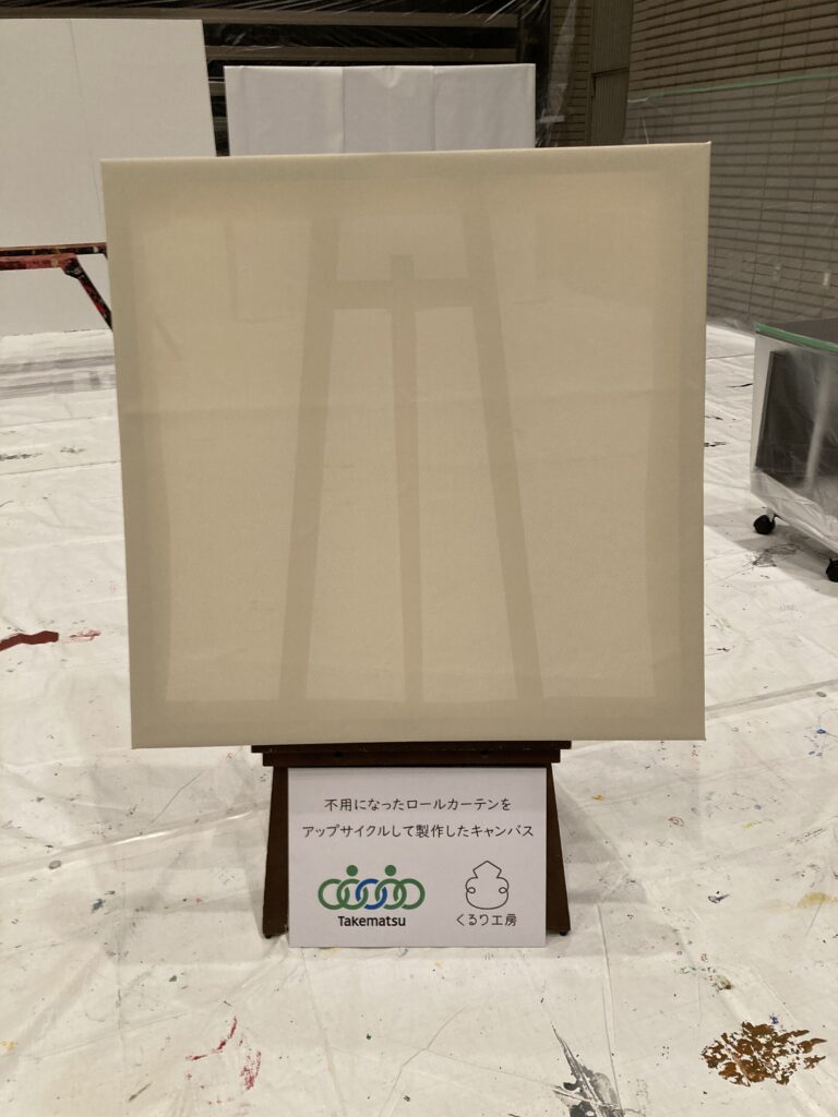 今年も、武松商事 くるり工房にご協力をいただき、こちらは不要になったロールカーテンをアップサイクルして製作した特製のキャンバスをご提供いただきました。