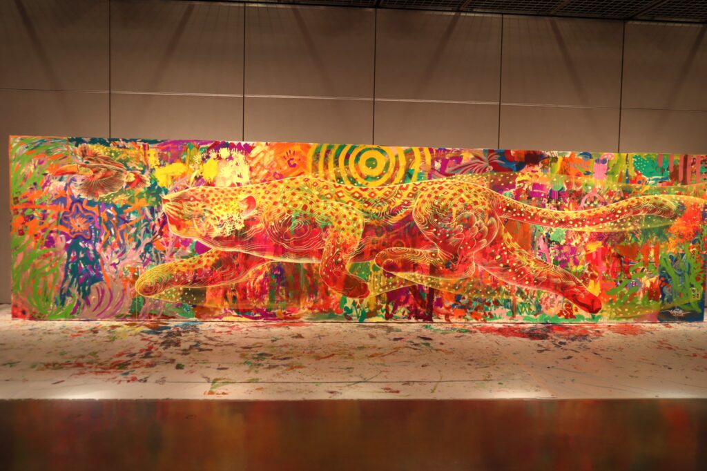 躍動するジャガーと南国の鳥が、皆さんが描いたキャンバスの上に見事に描かれ、観る者を圧倒します!!