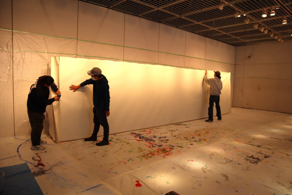 白い布地キャンバスを大きな板に張り付けて、巨大キャンバスが登場です!!