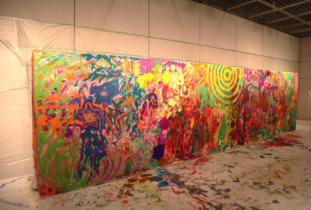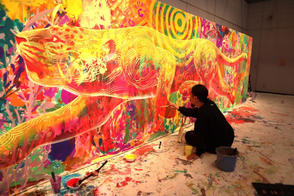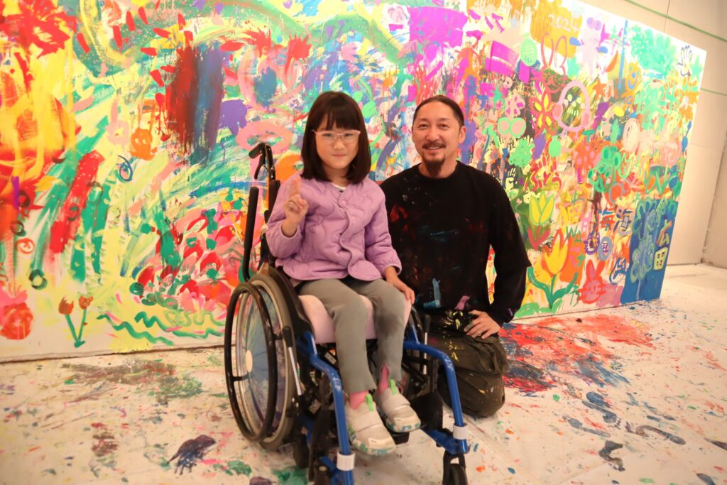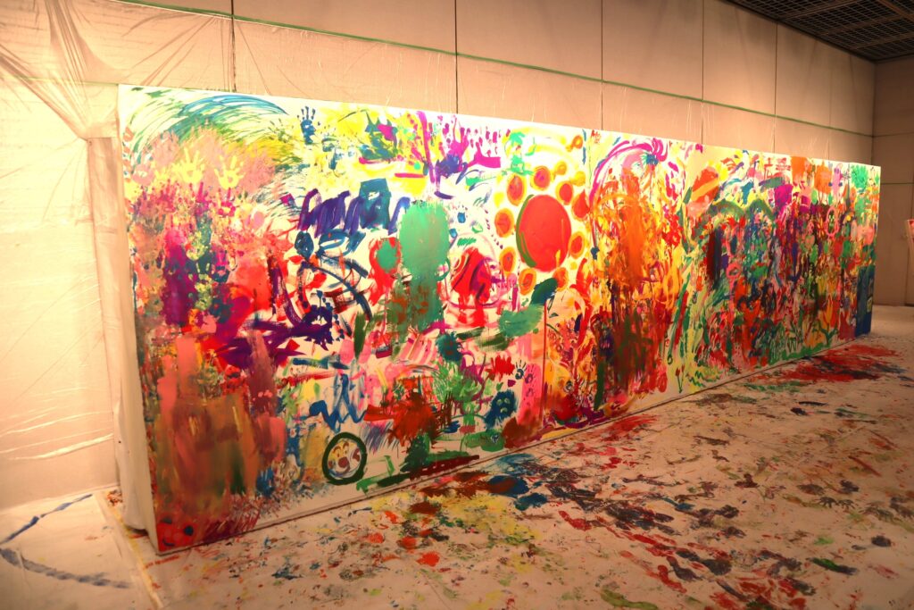 縦1.8m×横7mの巨大なキャンバスに、午前と午後2回の計3回に分かれて自由に描いてもらい、横浜を拠点に活躍するペインター「KENSUKE TAKAHASHI」さんに、最後に仕上げて頂く大人気イベントです。