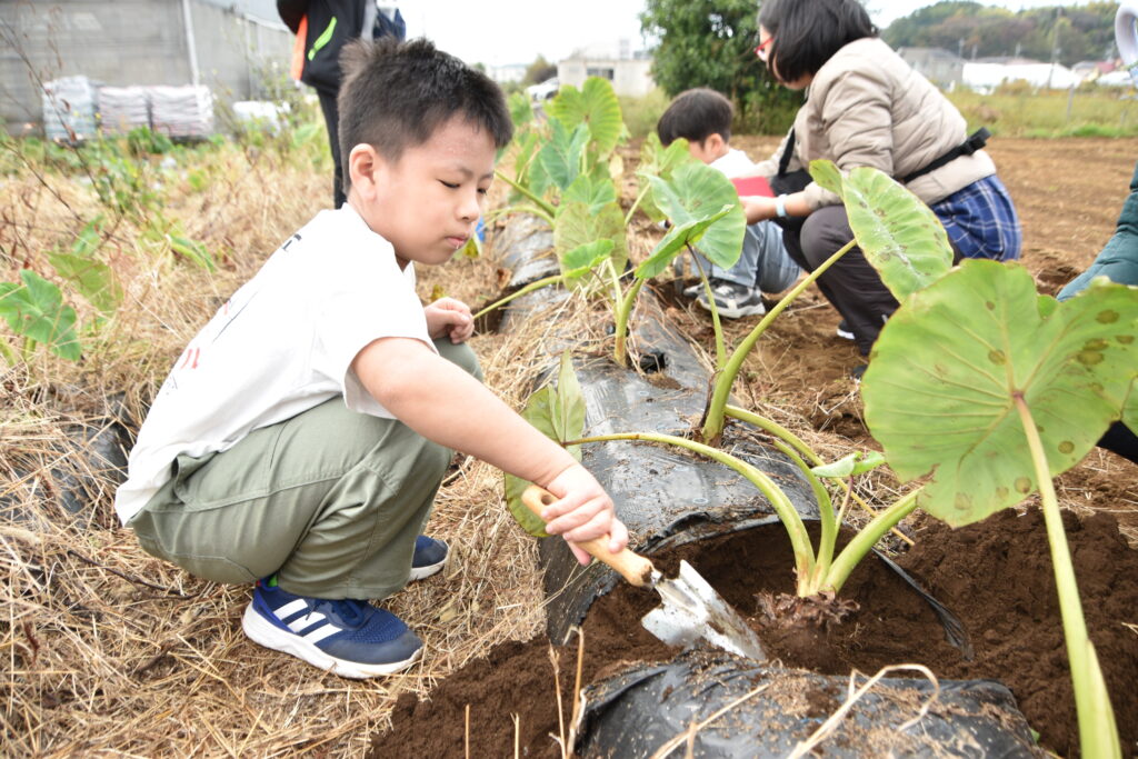 昼食後には、近所の農家さんの畑でサトイモ掘りを行いました。学校や地域で収穫体験をしたことがある子もいたようで、スコップを使ってサトイモを傷つけないように慎重に収穫していましたね。