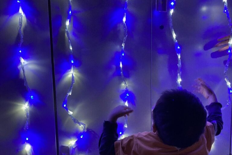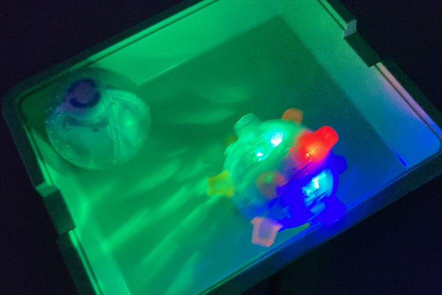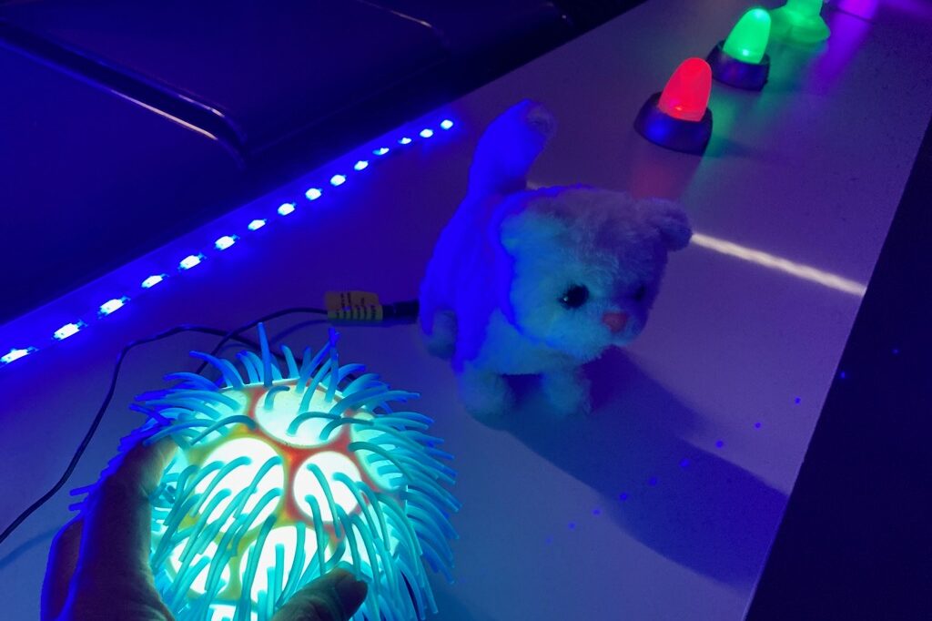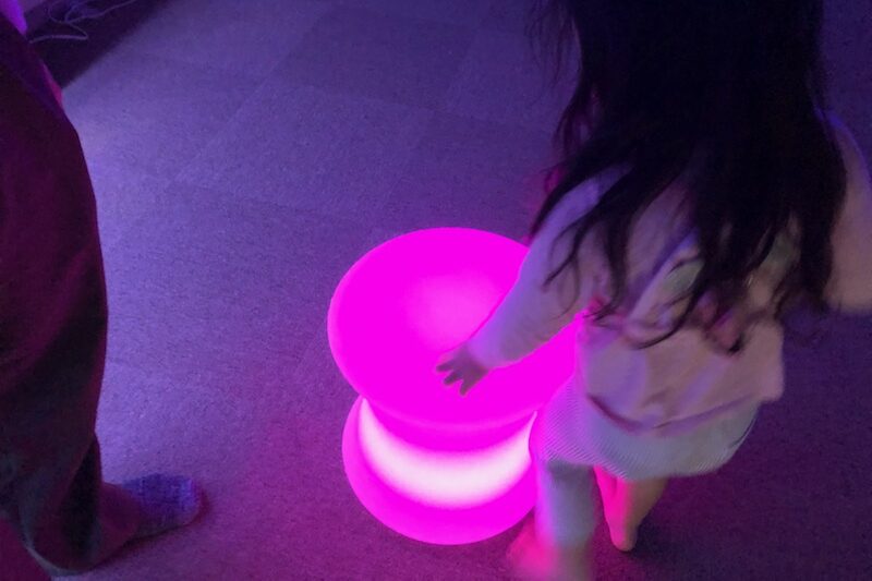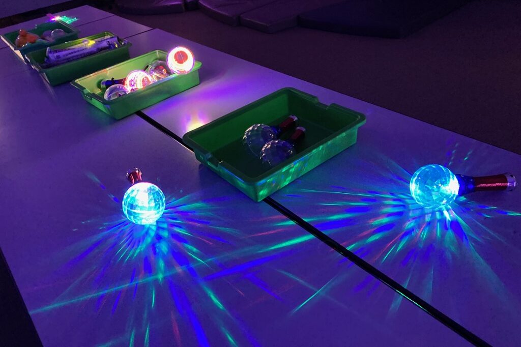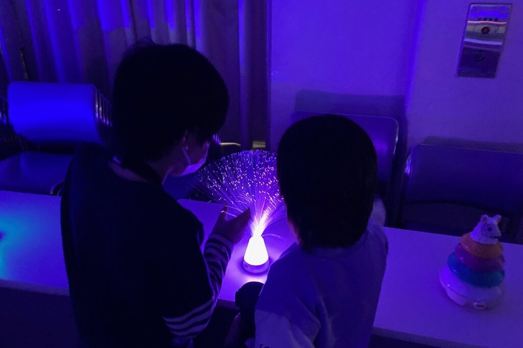 今年度6月に開催して大好評だった光あそびイベントの2回目です。まず、前回よりも、手持ちで遊べるおもちゃを増やしました!天井や床に照射できるライトや、光が回転するボール、光るスイッチをタッチすると猫が歩き出すスイッチおもちゃ、音楽を鳴らしながら動き回る光るボールなど…前回も参加した方からは、「新しいものが増えましたね!」と気づきのお声をいただきました。