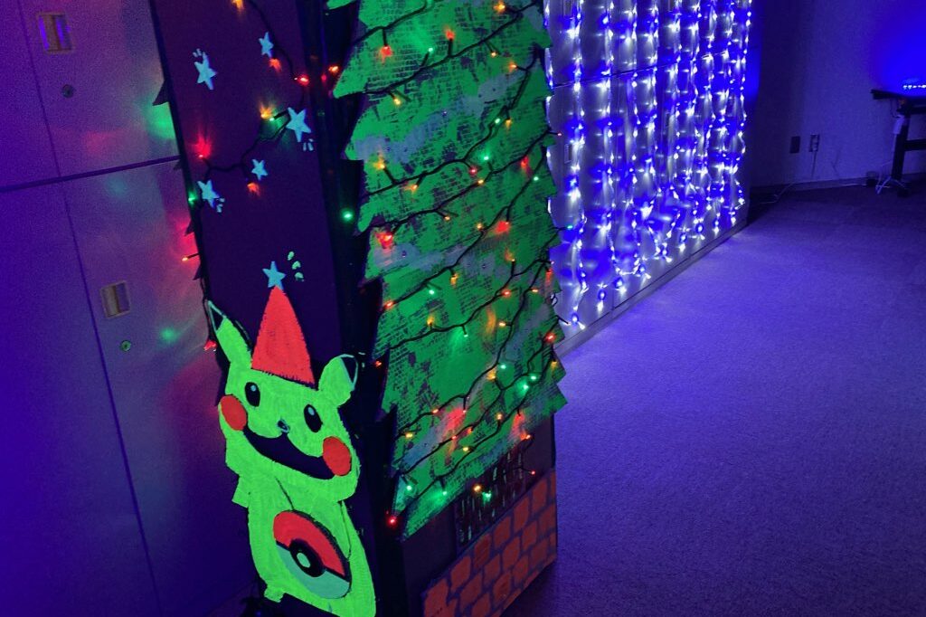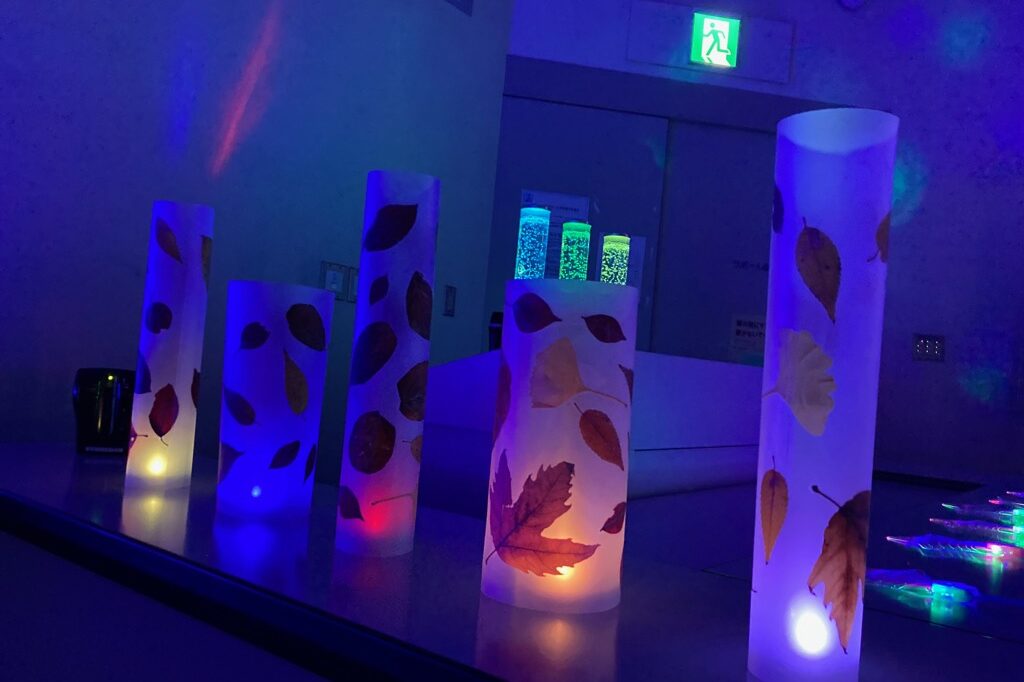 さらに今回は「手作りできるもの」として、市販の蛍光絵の具でカラーリングしたダンボールで作ったクリスマスツリー、落ち葉が透ける季節感を演出したライトポールをセッティングしました。ライトポールは、スタッフがイベント当日の朝拾ってきた落ち葉をラミネートして、100円均一ショップのLEDライトを仕込んで作りました!簡単にできるのにとっても見栄えする電飾になり、落ち葉ではなく好きなイラストやシールなどを貼り込むのもおすすめです。
