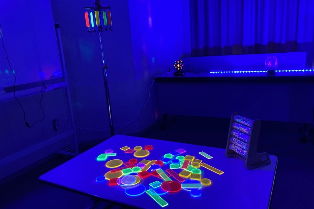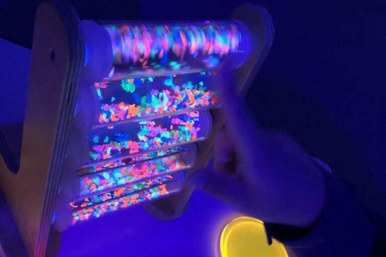 ブラックライトコーナーには、引き続き大人気の光るアクリル板つみき、そのそばにはおもちゃ図書館の貸出おもちゃ「蛍光チューブ」というおもちゃを置きました。このおもちゃは、何本かのアクリルチューブを手で回転させて、中に入っている細かい蛍光色の素材がチューブ内の鏡に映って反射してきらきらするのを楽しむセンサリーおもちゃなのですが、明るい場所でも十分楽しめるものです。ただ、今回実は、おもちゃ図書館担当も初めてこのおもちゃにブラックライトを当ててみてビックリ…!本当によく光ってきれいでした!