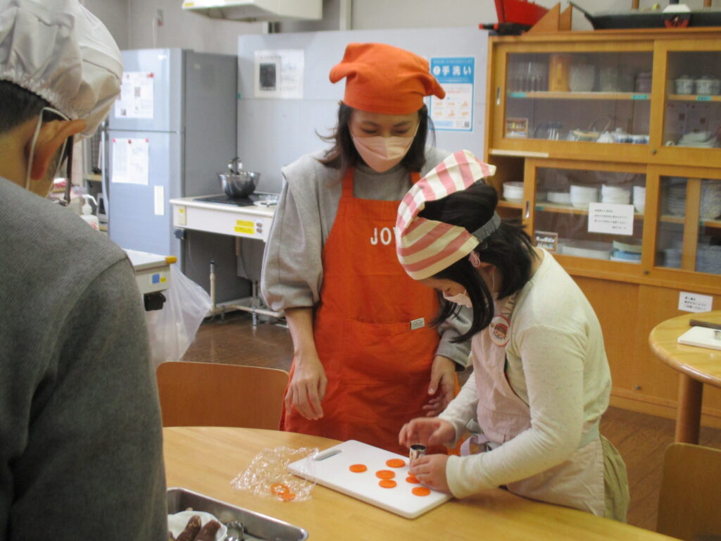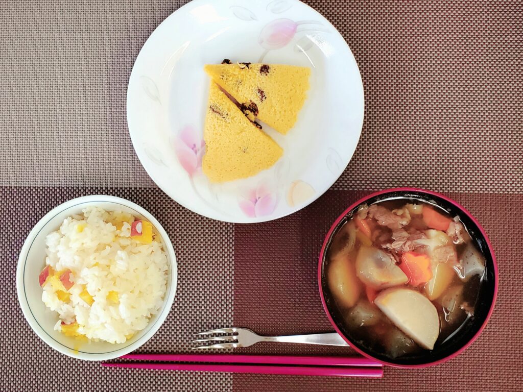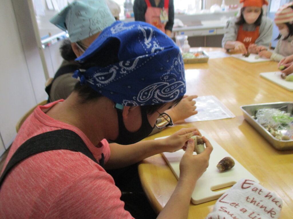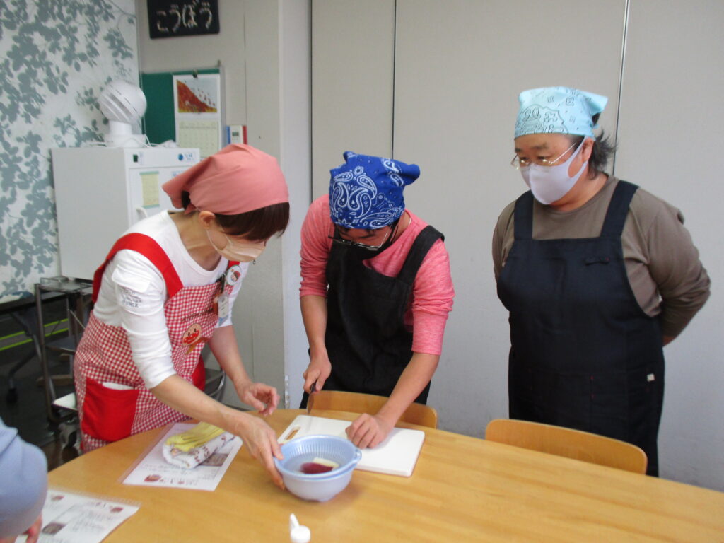 内容:今回、秋野菜がテーマで、「さつまいものおこわ」「里芋の芋煮汁」「おからの蒸しパン」を作りました。人参は型で抜き、里芋は蒸して皮をむきました。できあがりの里芋のほっこりした美味しさに、「思ったより簡単に皮がむけたので家でもやってみたい」と皆さん笑顔でした。さつまいも掘りに行ったお子さんもいて「今度はおこわを作ってみよう」と話していました。おからの蒸しパンも好評で「ジャムを使ってもいいね」とアレンジの話も弾み、みんなで楽しい時間を過ごせました。