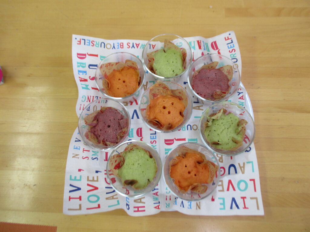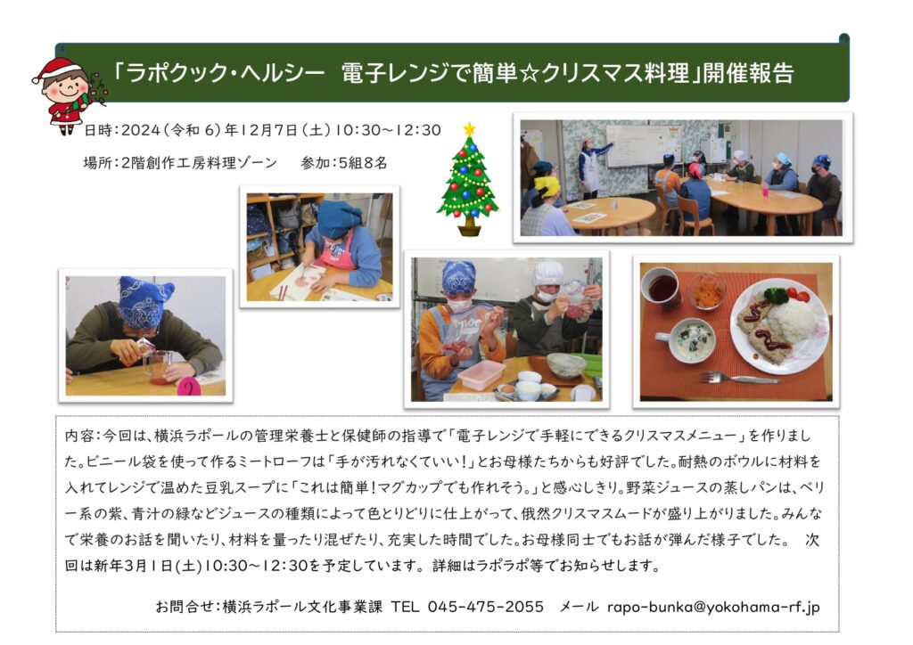内容:今回は横浜ラポールの管理栄養士と保健師の指導で「電子レンジで手軽にできるクリスマスメニュー」を作りました。ビニール袋を使って作るミートローフは「手が汚れなくていい!」とお母様方からも好評でした。耐熱のボウルに材料を入れてレンジで温めた豆乳スープに「これは簡単!マグカップでも作れそう。」と感心しきり。野菜ジュースの蒸しパンは、ベリー系の紫、青汁の緑などジュースの種類によって色とりどりに仕上がって、俄然クリスマスムードが盛り上がりました。みんなで栄養のお話を聞いたり、材料を量ったり混ぜたり、充実した時間でした。お母様同士でもお話が弾んだ様子でした。次回は新年3月1日(土)10:30~12:30を予定しています。詳細はラポラポやHPでお知らせします。