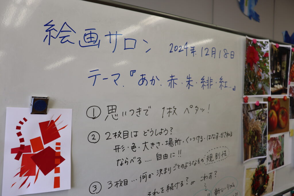 2024年も、残すところあとわずかとなってまいりました。12月の絵画サロンでは、「あか(赤)(朱)(緋)(紅)」というテーマで開催しました。「あか(色)」といっても、いろいろな「あか」があります。絵画サロンの冒頭では、そんなさまざまな「あか」の色の画用紙を使って、好きな形に切ったり貼ったりしながら、自由に「あか」を表現します。