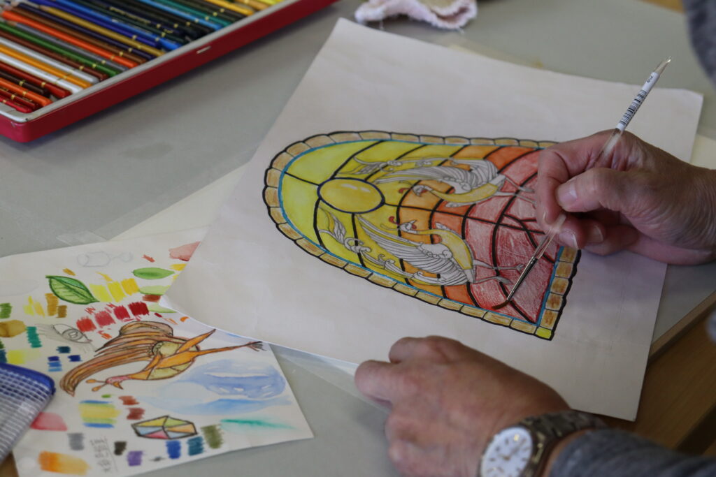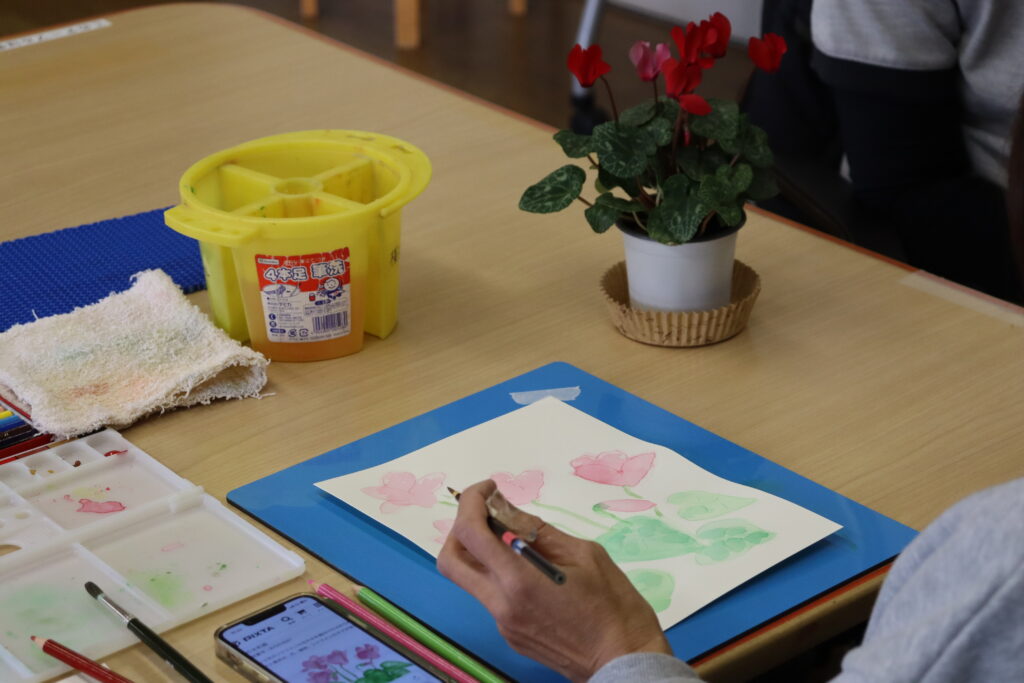 その後は、各自で自由に絵を描いていきます。絵画サロンは、描くためのとっかかりとして、毎月「テーマ」を設けていますが、テーマにとらわれずに最初から自分の好きなものを描くこともでき、自由度の高いサロンとなっています。道具は、自分で持ち込むこともできますし、ラポールにある水彩絵の具や色鉛筆などを使って、描くこともできます(※油絵はできません)
