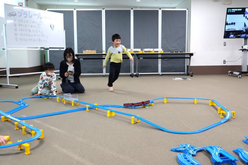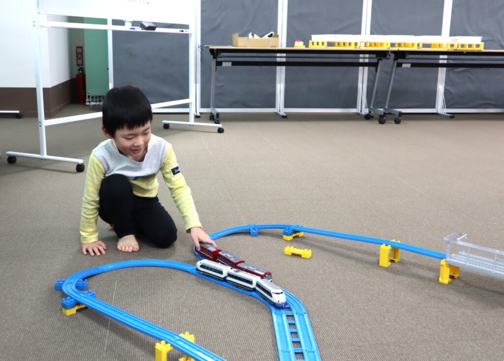 ラポール上大岡8階・多目的室の広い空間を使って、自由にプラレールを組み立てて、2時間思いっきり遊ぶことが出来る「プラレールであそぼう!」