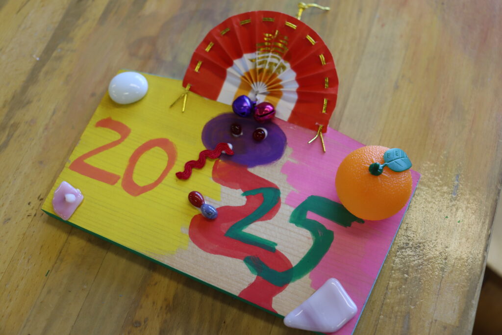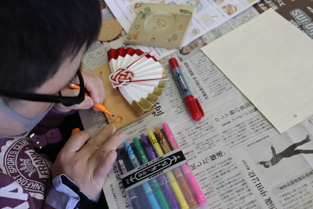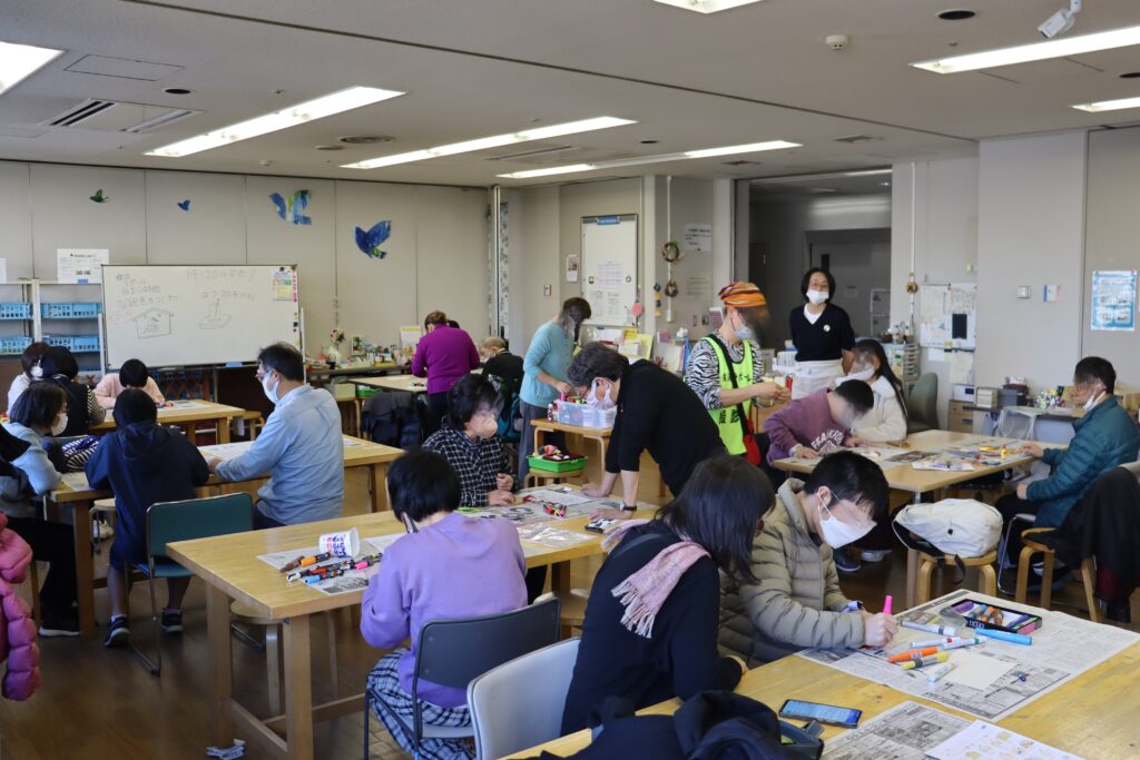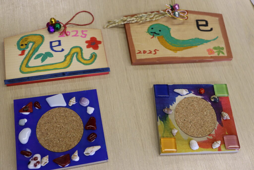 図工の時間は、主に障害のある小学生以上の方を対象とした、工作系のプログラムです。つくるものはその時々で変わりますが、1月は、「アート絵馬」と「コースター」を作りました。12組21名の参加があり、工房がとても賑わっていました!
