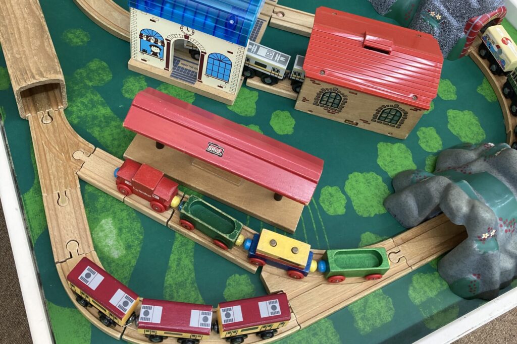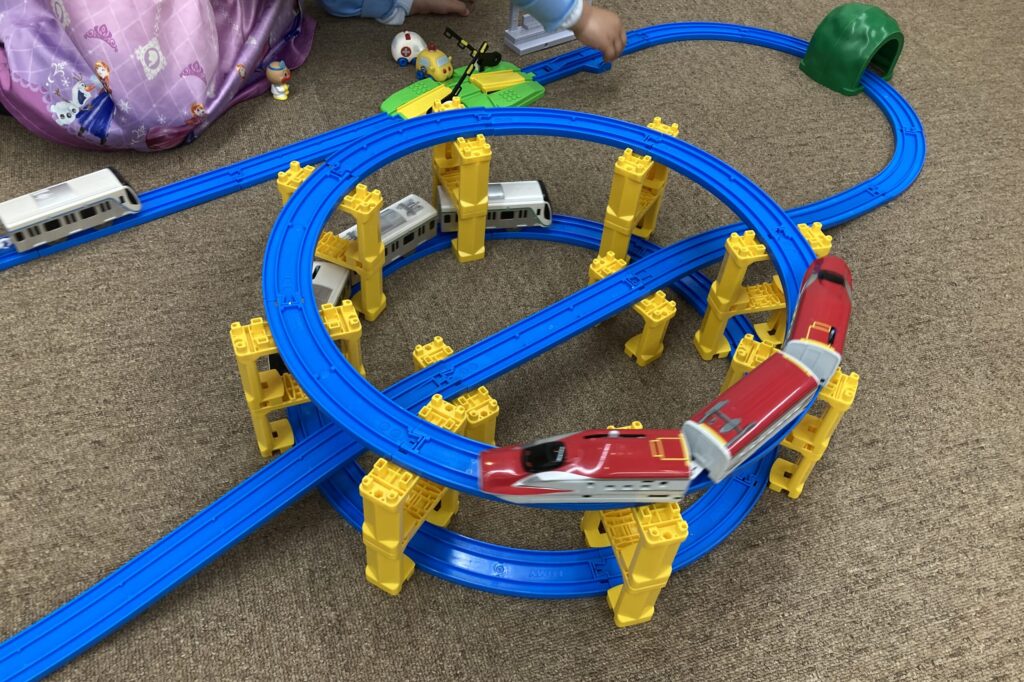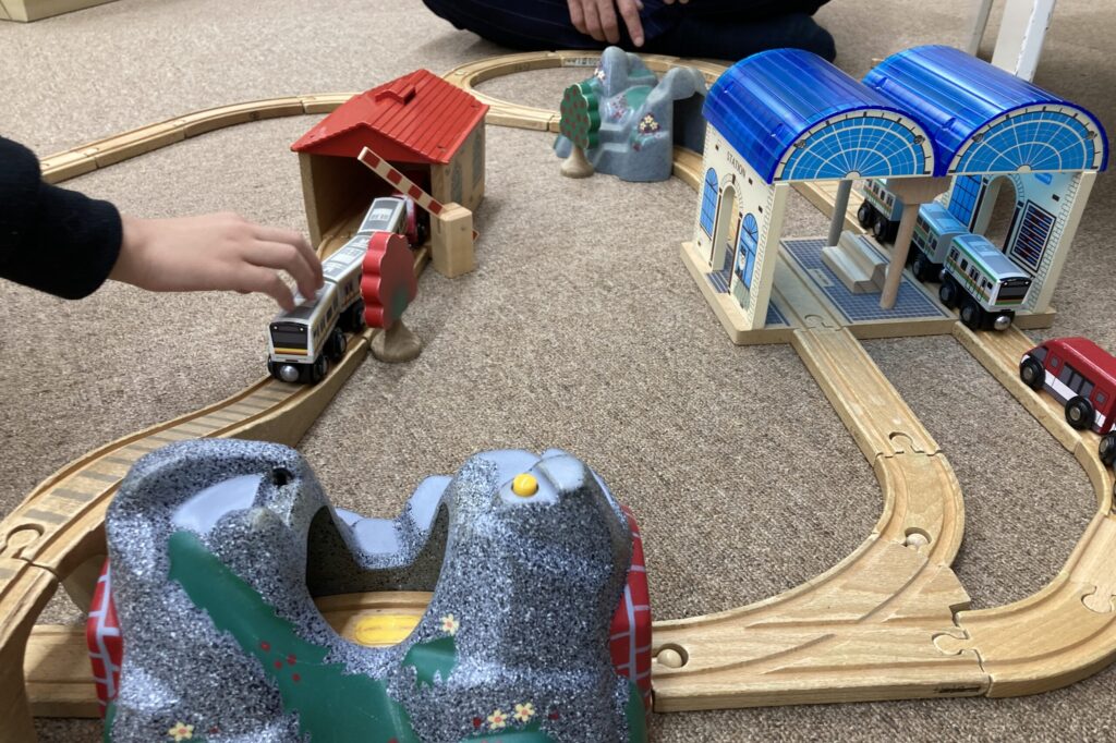 プラレールでは遊ばないきょうだい児さん、プラレールは走らせたいけれどまだレールは組めないので、ご家族がプラレールを組み上げるまで待ちきれないお子さん、プラレールは完成して走らせたままにしつつも、ちょっと他のおもちゃで遊びたい、動き回りたいお子さんなど・・・このコーナーを上手に使いながらゆったり遊べたようです。車の立体マップと木製のレールセットも人気がありました。