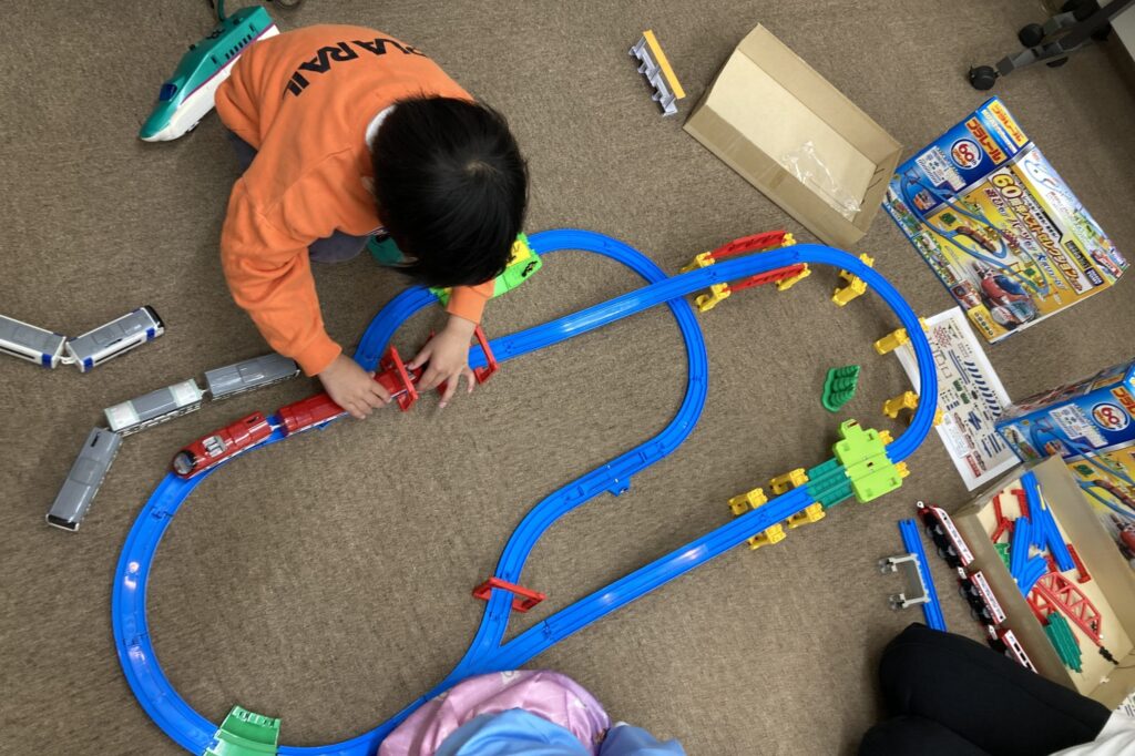 今日初めてご家族でプラレールを楽しめたとのことで、お父さんが電車同士がぶつかり合わないようにタイミングを計って線路の切り替えをしたり、弟さんも一緒に間近でプラレールを眺めることができ、とても楽しそうでした!