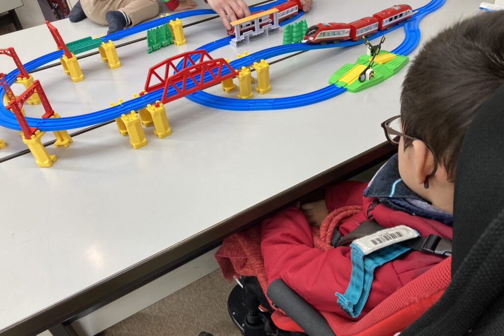 こんな風に、テーブル上でもプラレールを組むことができますので、今後のイベントも車椅子やストレッチャーをご利用のお子さんもぜひご参加くださいね。また、実際にやってみて気づいたことなのですが、このテーブル上で組んだレールは、絨毯の上で組んだレールよりも消音効果がない分、逆に「がしゃん、がしゃん・・・」と電車が走る音に迫力があり、目線の高さで見られる位置がとてもよかったです。