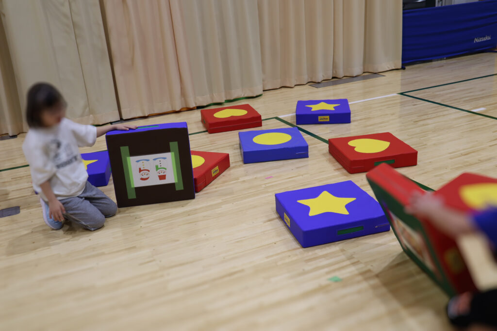 大きなクッションや段ボールを使った神経衰弱ゲーム、季節にちなんだ豆まきなど、いろんな遊びに挑戦! 夢中で遊んでいるうちに、自然といろんな動きが身についていきます👍✨