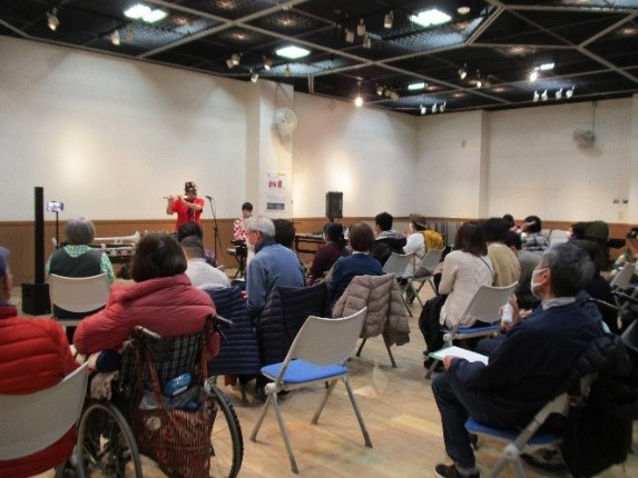視覚障害の方の参加も多く、配られた手作り楽器でリズムをとったり、歌ったり、アンコールが終わっても名残り惜しそうでした。国内外の人気ポップスやオリジナルの楽曲、童謡など、年齢を問わず楽しめるプログラムで、これからも続けてほしいという声があがっていました。次回は2025年7月に予定しています。