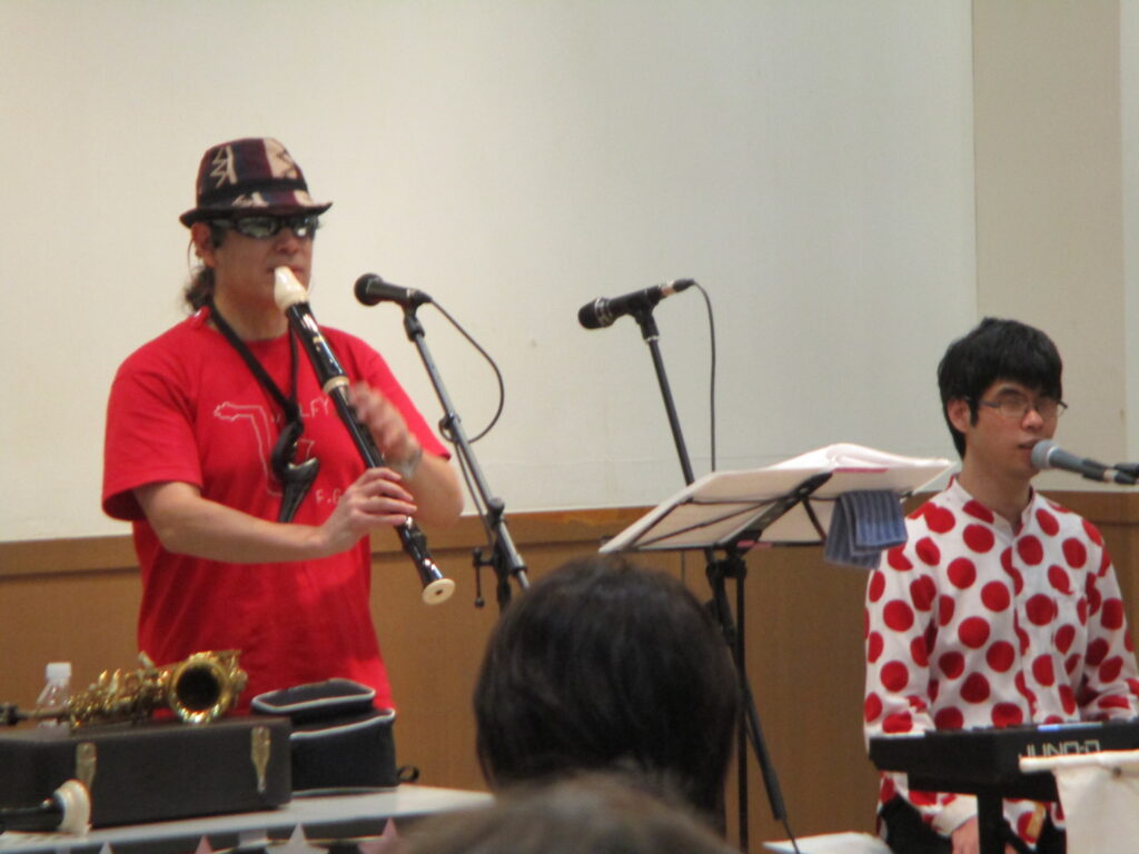 内容 Ko-sei、ウォルフィー佐野、2人のスペシャルアーティストを迎えて、「第2回 親子の音楽広場~サンデーフレッシュミュージック」を開催しました。Ko-seiさんの軽快な司会、ウォルフィー佐野さんとの素敵なセッションに、会場はおおいに盛り上がり、立ち上がってリズムをとる方もいらっしゃいました。サックス奏者のウォルフィー佐野さんは、サックス、トロンボーン、フルート、オカリナ、様々な素材や大きさのリコーダー等を演奏しながら紹介してくれました。途中、「Banso club」のエミリーさんも篠笛で登場、セッションに深みが加わりました。