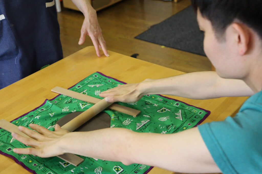 陶芸の道具も自由にお使いいただけます。板と棒をつかって、粘土の厚さが均一になるように伸ばしてつくる「たたらづくり」。お皿などを作るときは、このやり方が簡単です。