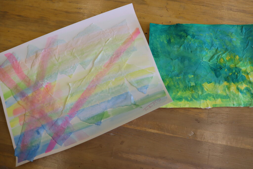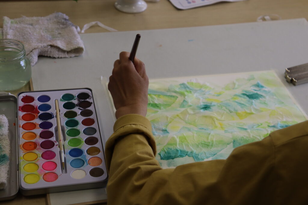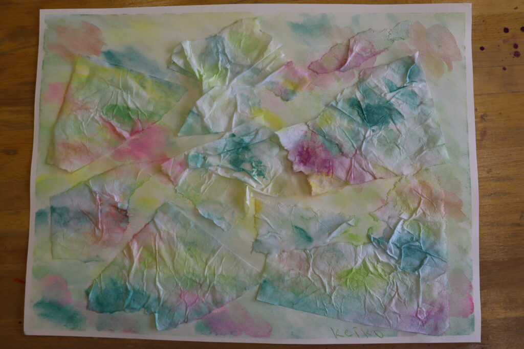 5月のテーマ制作では、最初に書道などで使用する「半紙」を思いのままにちぎって、画用紙に張り付け、水をたっぷり含んだ絵の具で色付けしていきます。