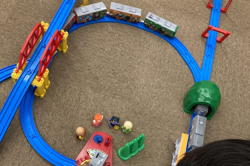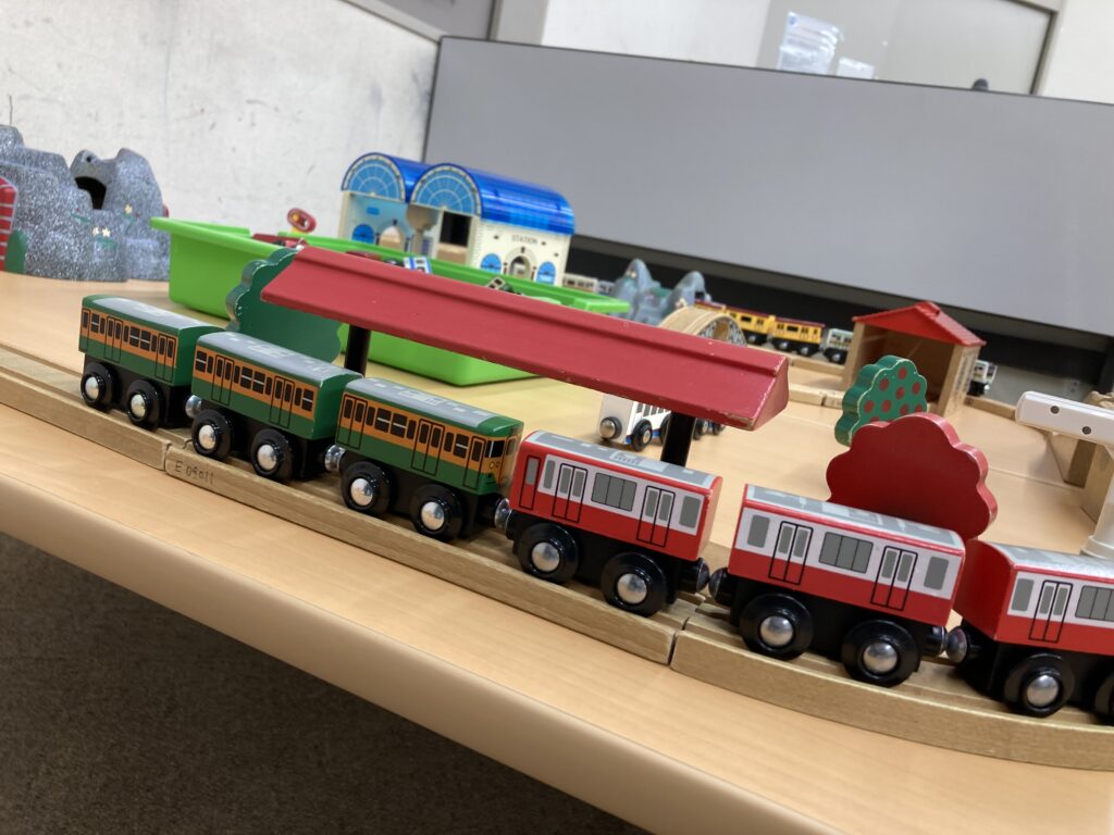 ミニカーやキャラクターの指人形などもあり、一生懸命レールを繋いだ後は、好きなものを思う存分並べて嬉しそうに眺めるお子さんも多かったです。また、木製のレールセットもありますので、自分で列車を動かしたいお子さんにはこちらのアナログ感も大人気でした。