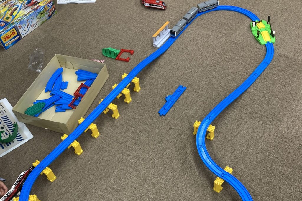 ひとりワンセットのプラレールと、自由に組み合わせられるフリーパーツを使って、皆さん思い思いにレールを繋いで楽しめるイベントです。