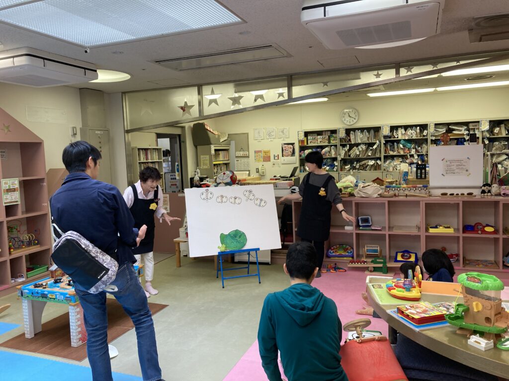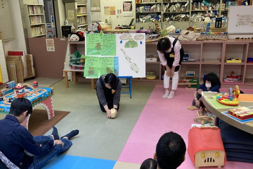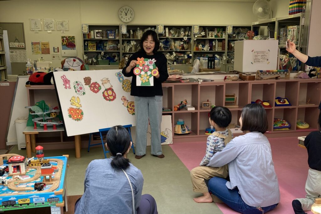 おもちゃ図書館のあそびエリアで開催している「ハッピーバースデータイム」は、楽しいお話、パネルシアター、お歌、手遊びなどを楽しめる時間です。お誕生月のお子さんには、みんなからの「ハッピーバースデー」のお歌とお写真カードのプレゼントでお祝いさせていただいています。お子さんたちは、思い思いに好きなおもちゃで遊びながらシアターを見たり聞いたり、自由に参加できるイベントです。