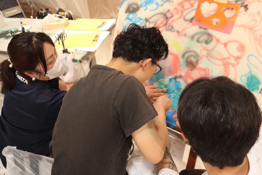 エアブラシとステンシルを使って好きながらの作品を作ります。今回は体験だけでなく、実際に大きなキャンバスにもエアブラシを使用して描くことができました。
