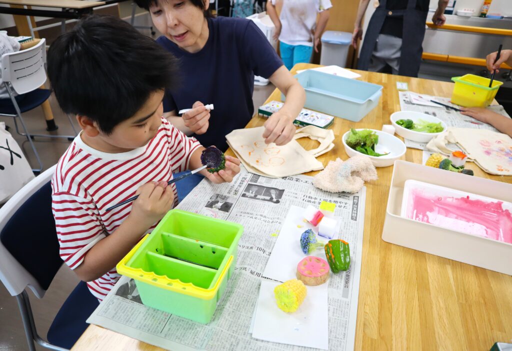 各自に渡されたカットされた野菜に、アクリル絵の具を付けて、スタンプのように押していきます。