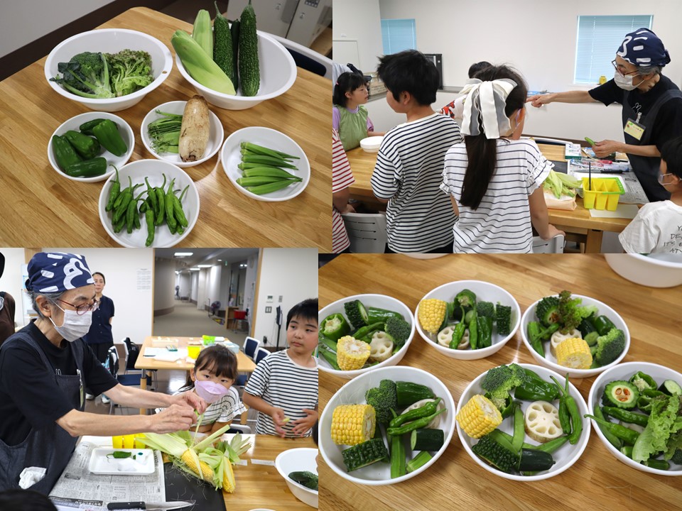 夏野菜のピーマンやオクラ、ゴーヤにししとう等10種類の野菜を用意し、野菜の切り方によって色んな形になるのを実際に参加者に見せながら講師が説明していきました。