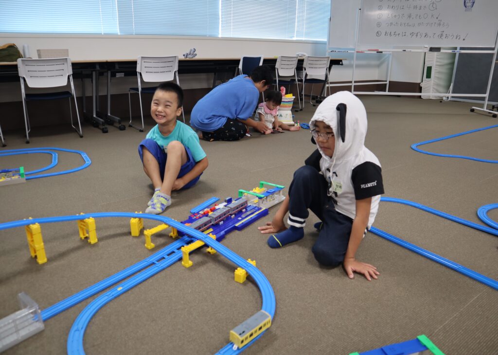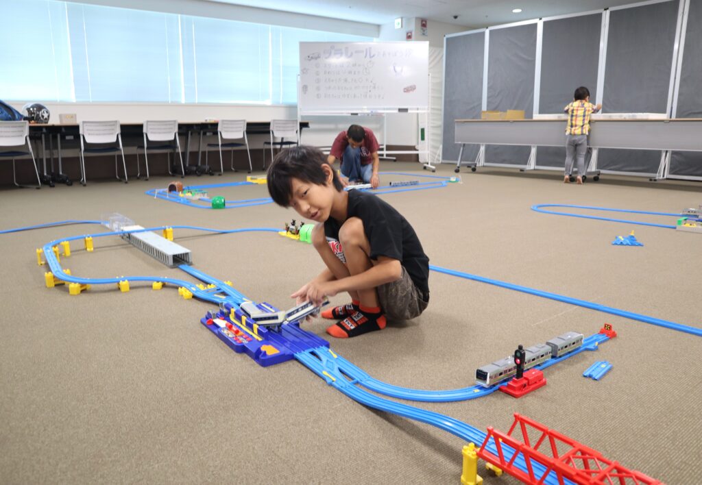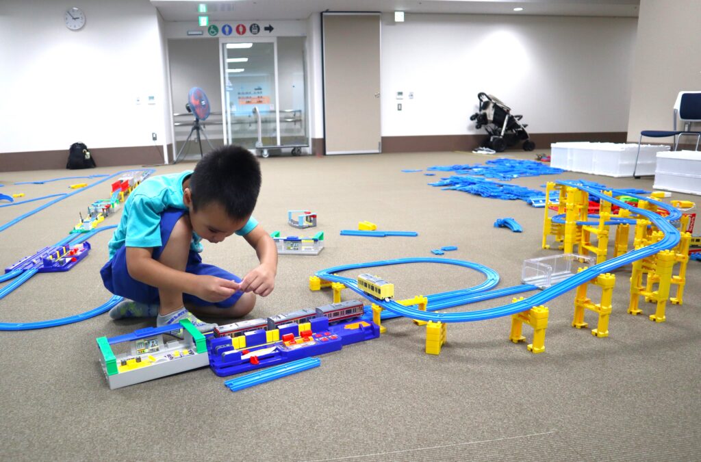 ラポール上大岡8階・多目的室の広い空間を使って、自由にプラレールを組み立てて、2時間思いっきり遊ぶことが出来る「プラレールであそぼう!」