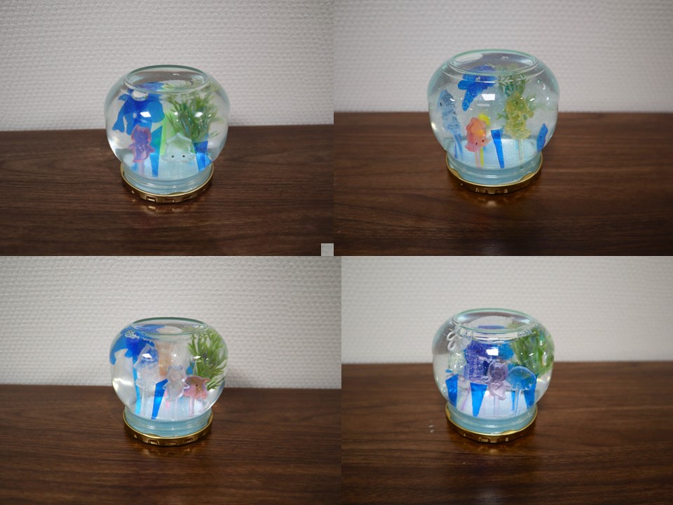 サマードームはクリスマスシーズンによく見かけるスノードームの夏版で、液体が入っている透明な容器の中に夏らしいグッズを入れ、光る粒子も入れて、振るとキラキラする飾り物です。