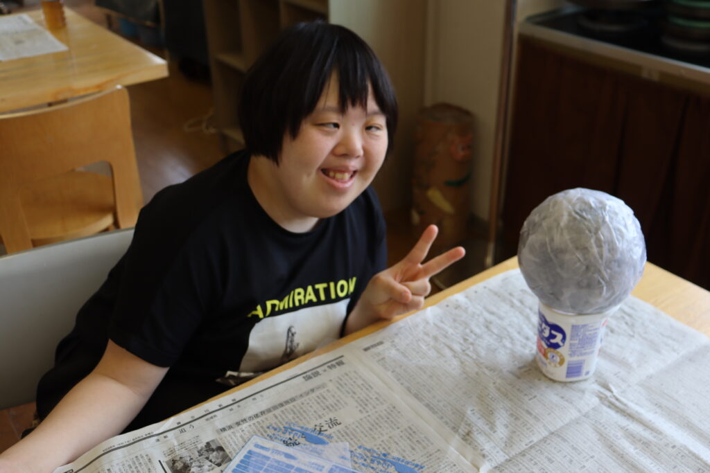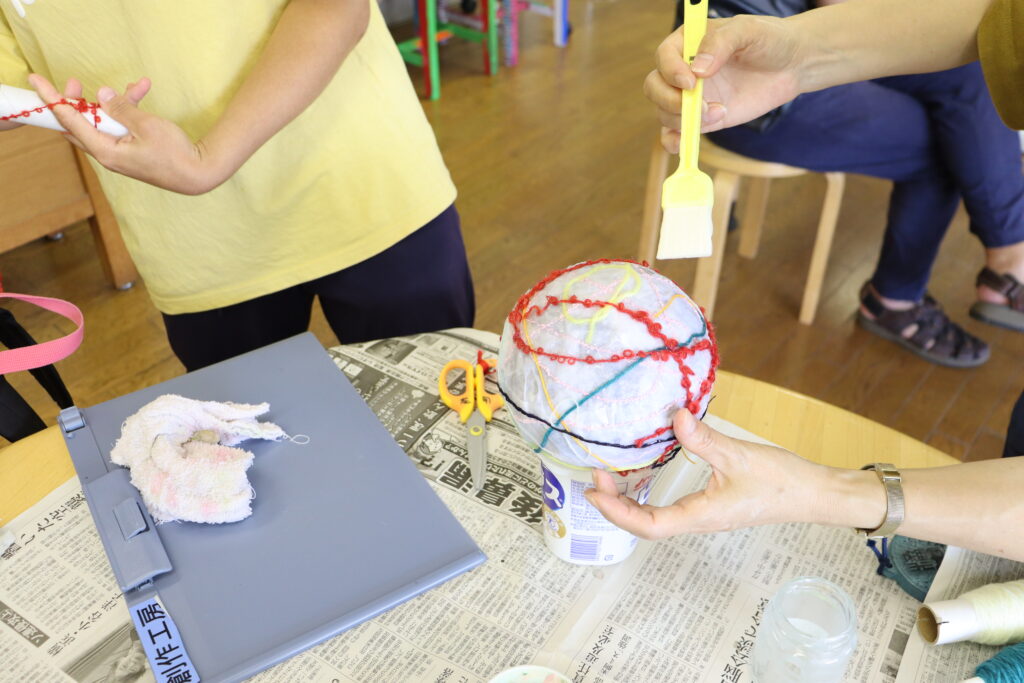 糊が乾燥するまでに時間がかかるため、自宅に帰ってから風船を割ると完成です。ものづくり広場は、高校生以上を対象に、毎回ユニークな立体造形が楽しめます!!あなたも是非チャレンジしてみませんか?広報誌「ラポラポ」やチラシをチェックしてぜひお申込ください!お待ちしております。