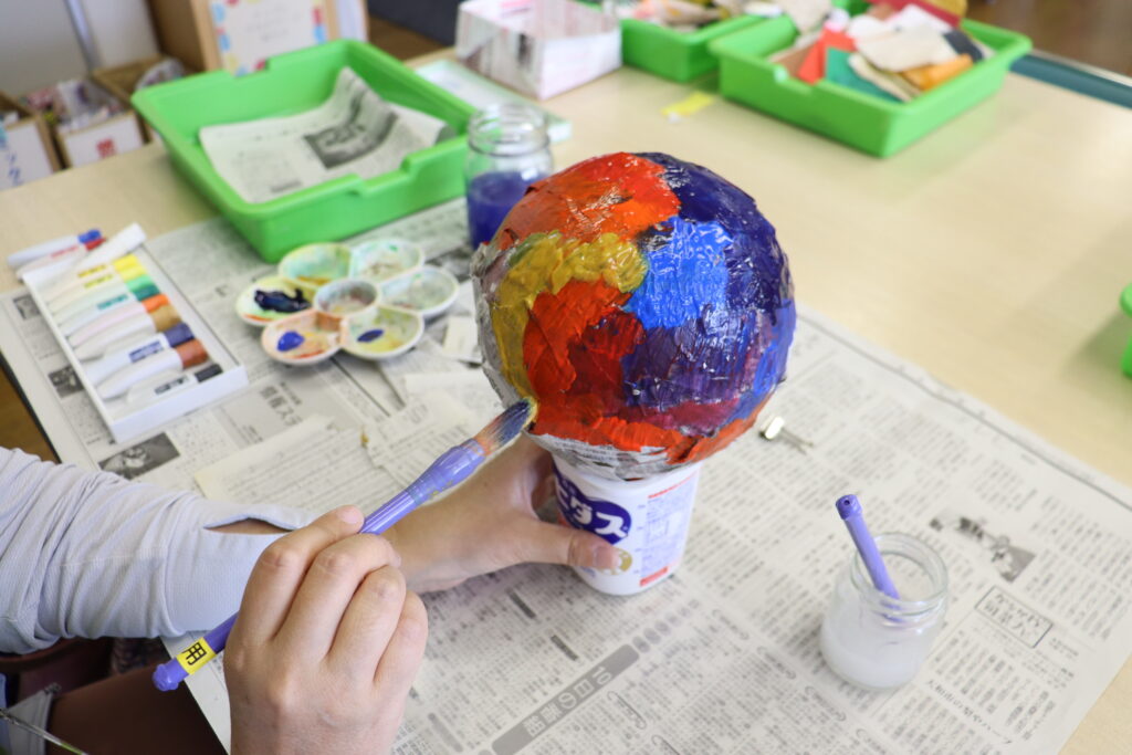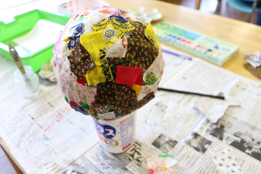 風船に新聞紙や半紙を貼り付けたら、いよいよデコレーション。絵の具で塗るもよし、布を貼り付けるもよし、毛糸をぐるぐる巻きにするもよし!みなさん、自分の感性でさまざまな張り子ができました。